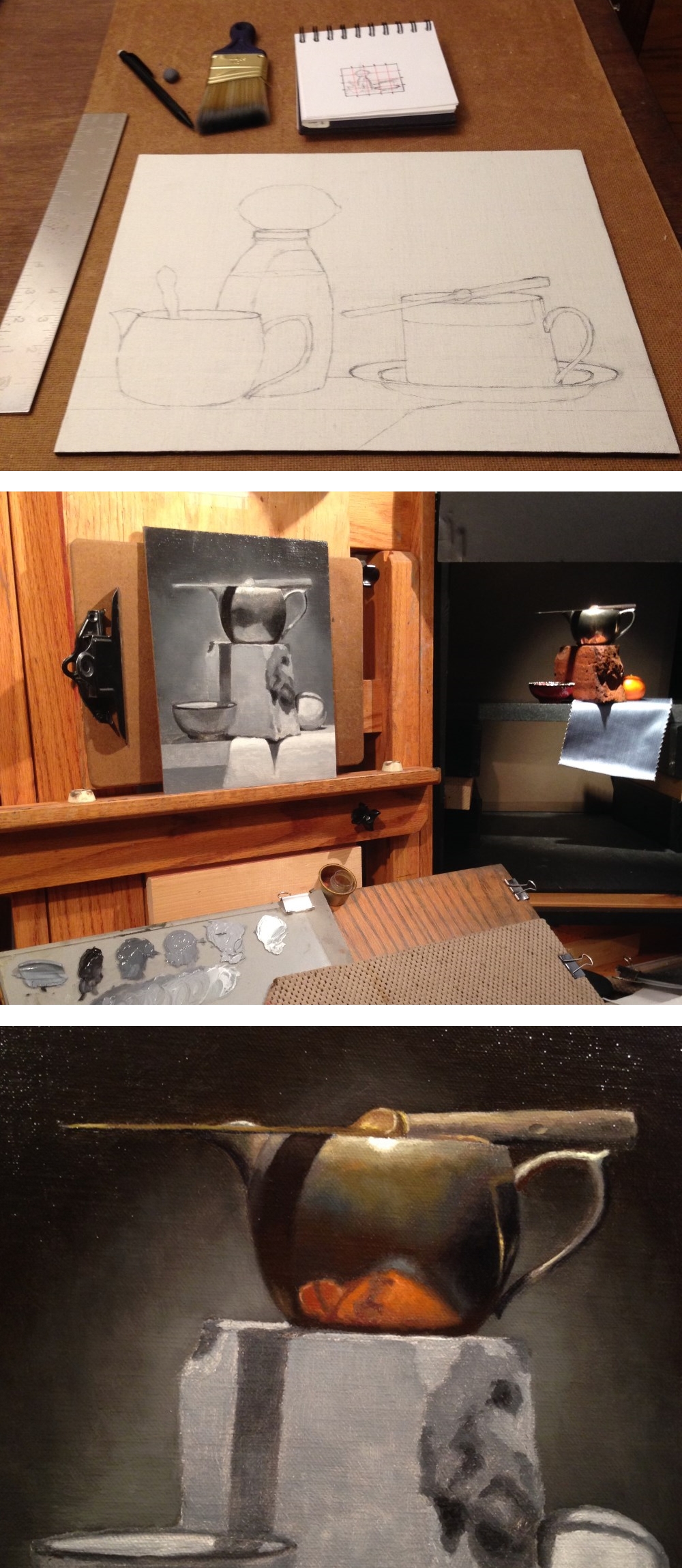 Second, a black and white version is painted over the drawing. Called an underpainting, it allows the artist to understand of the patterns of light and dark as well as create 3-dimensional form – without the complexity of mixing color. In a way, it also serves as a dress rehearsal for the final painting. It must be set aside for a week or two to dry before proceeding.