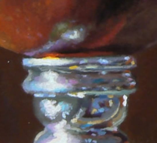 “Pomegranate No. 3” features a ripe pomegranate against a deep rich red background, resting on a silver candlestick from the Mexican city of Cuernavaca.