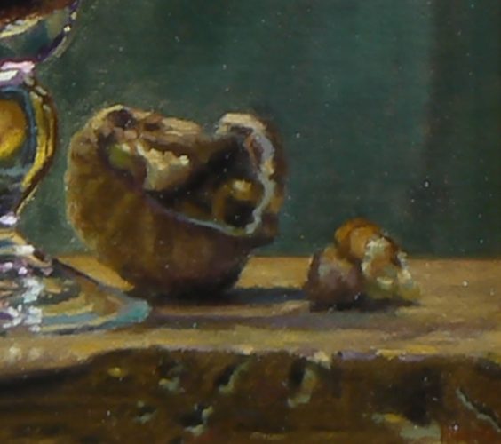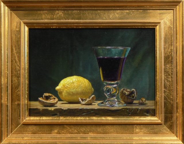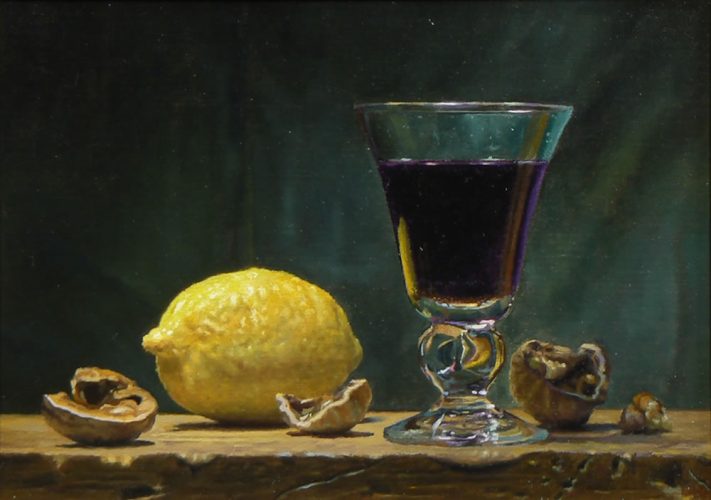“Walnuts, Lemon, and Wine” is a simple arrangement inspired by the masterpieces of Dutch still life painting, featuring an antique glass filled with red wine, a fresh lemon, and cracked walnuts, all resting on a weathered shelf.