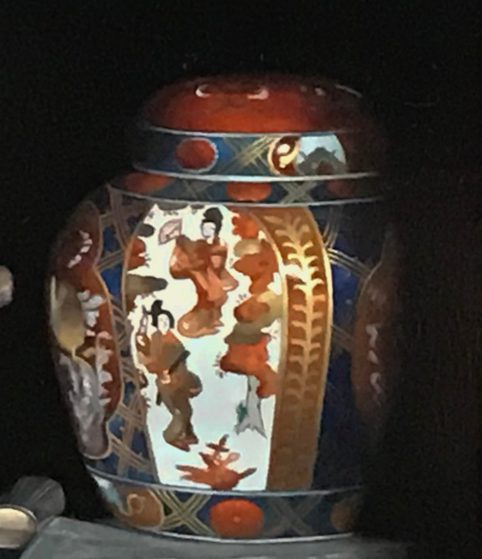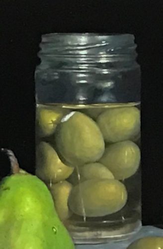 This week’s featured painting is “Olives, Creamer, Pear, Ginger Jar” from 2021. It is done with oil on panel, and measures 18 x 30 inches.