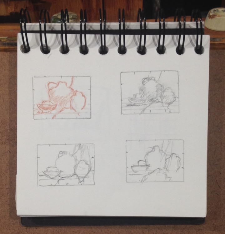 Several studies are made of the model; thumbnail sketches in pencil and small full-color studies in oil.