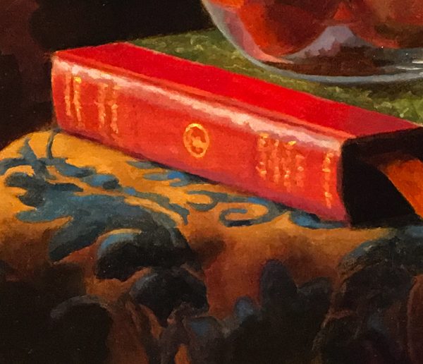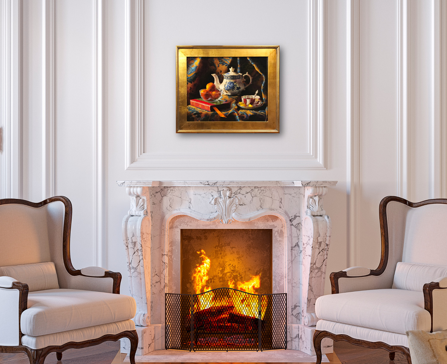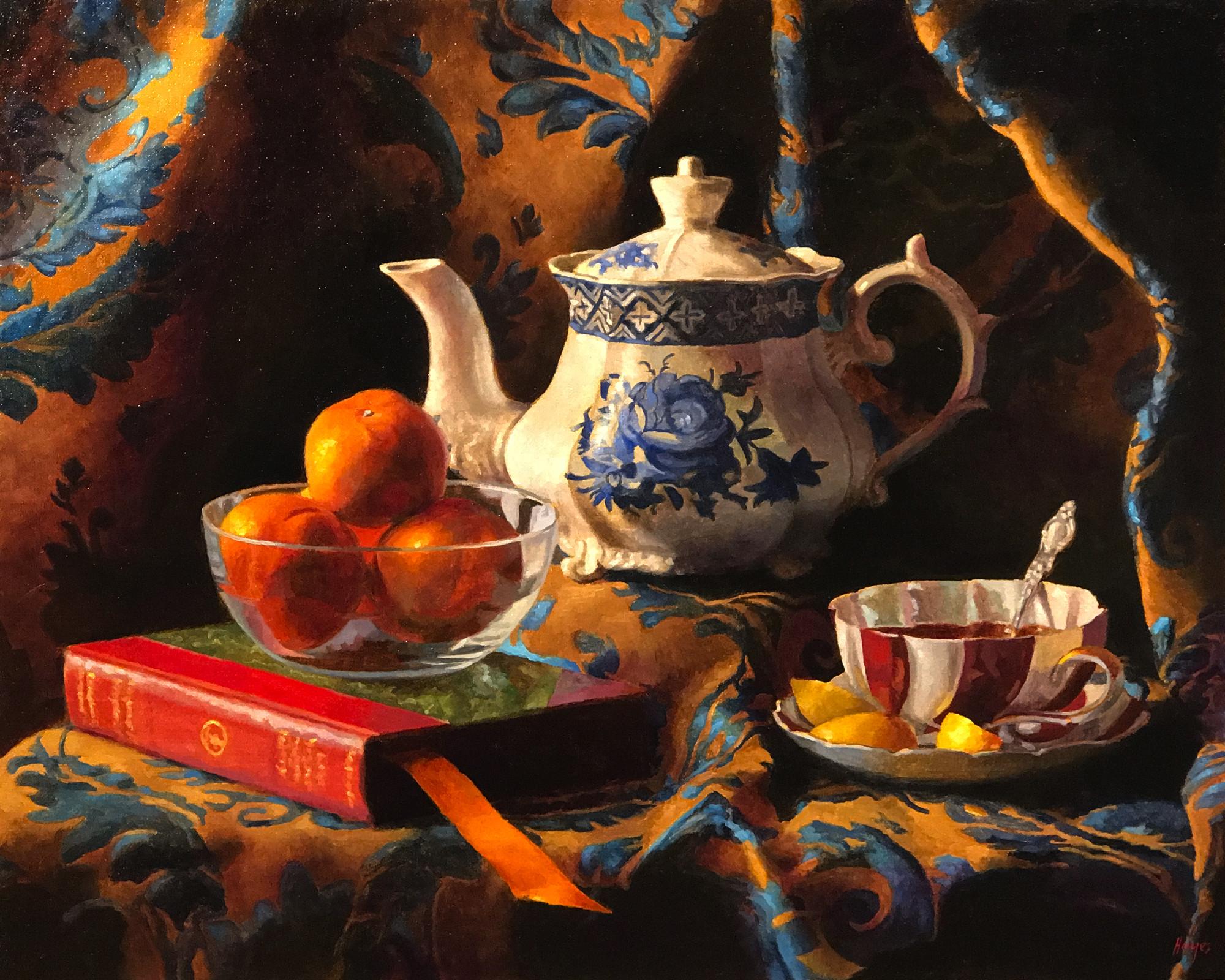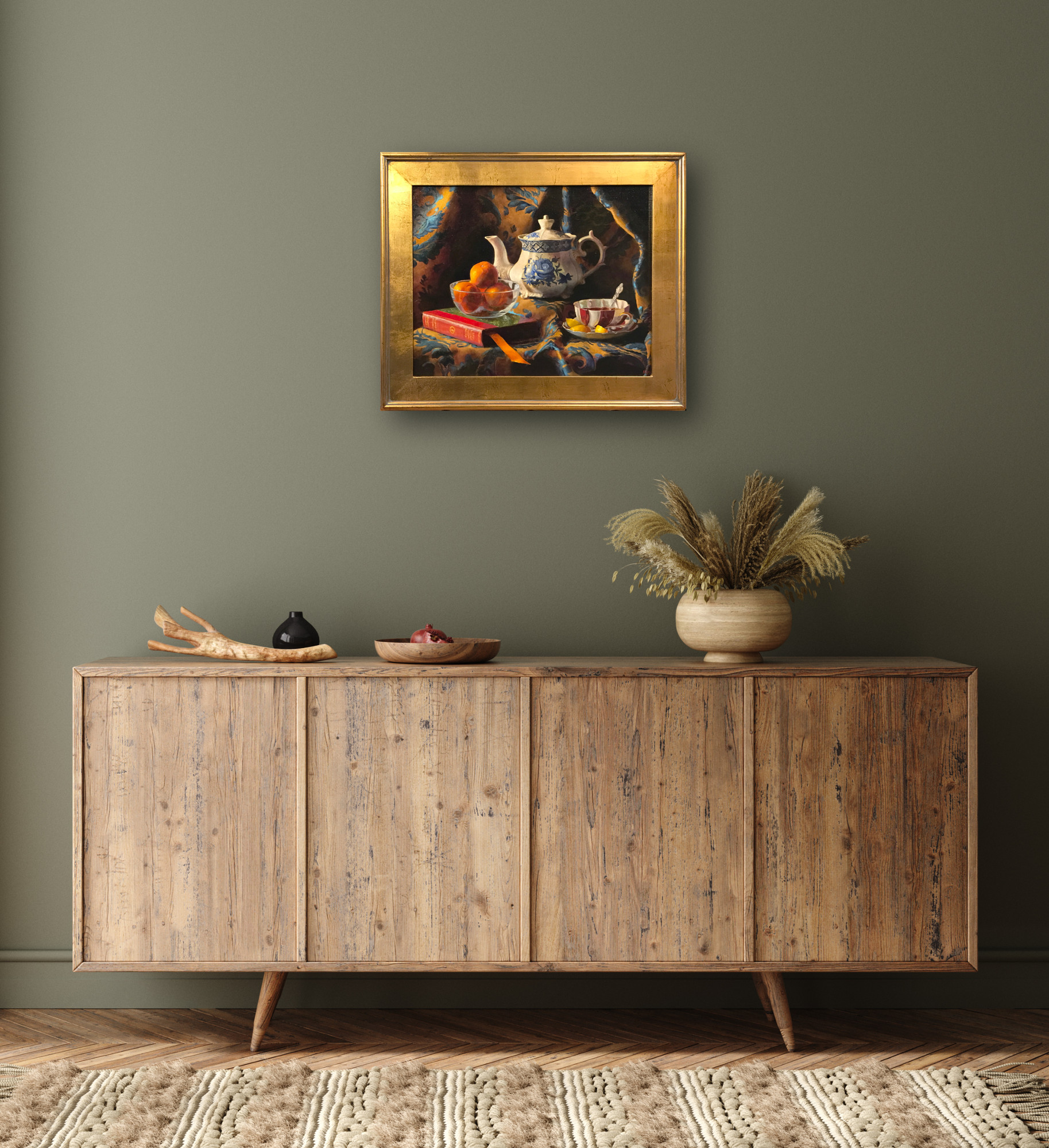 This painting captures more than just objects—it evokes a sense of presence and contemplation. The interplay between the ornate and the everyday invites the viewer to linger, to imagine the stories these objects hold. The teapot suggests a moment of pause, the teacup and oranges evoke the pleasures of simplicity, and the book speaks to the timeless comfort of getting lost in its pages.