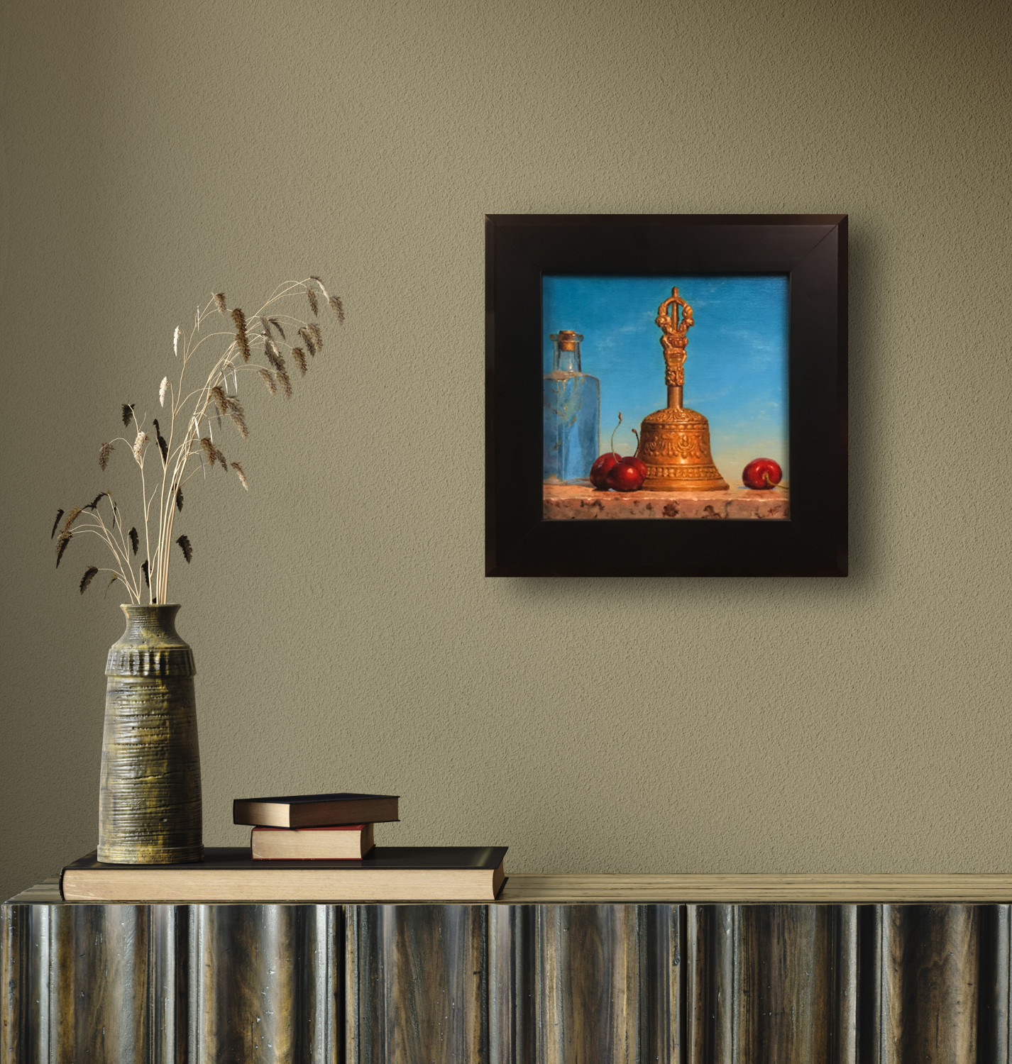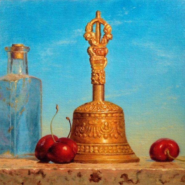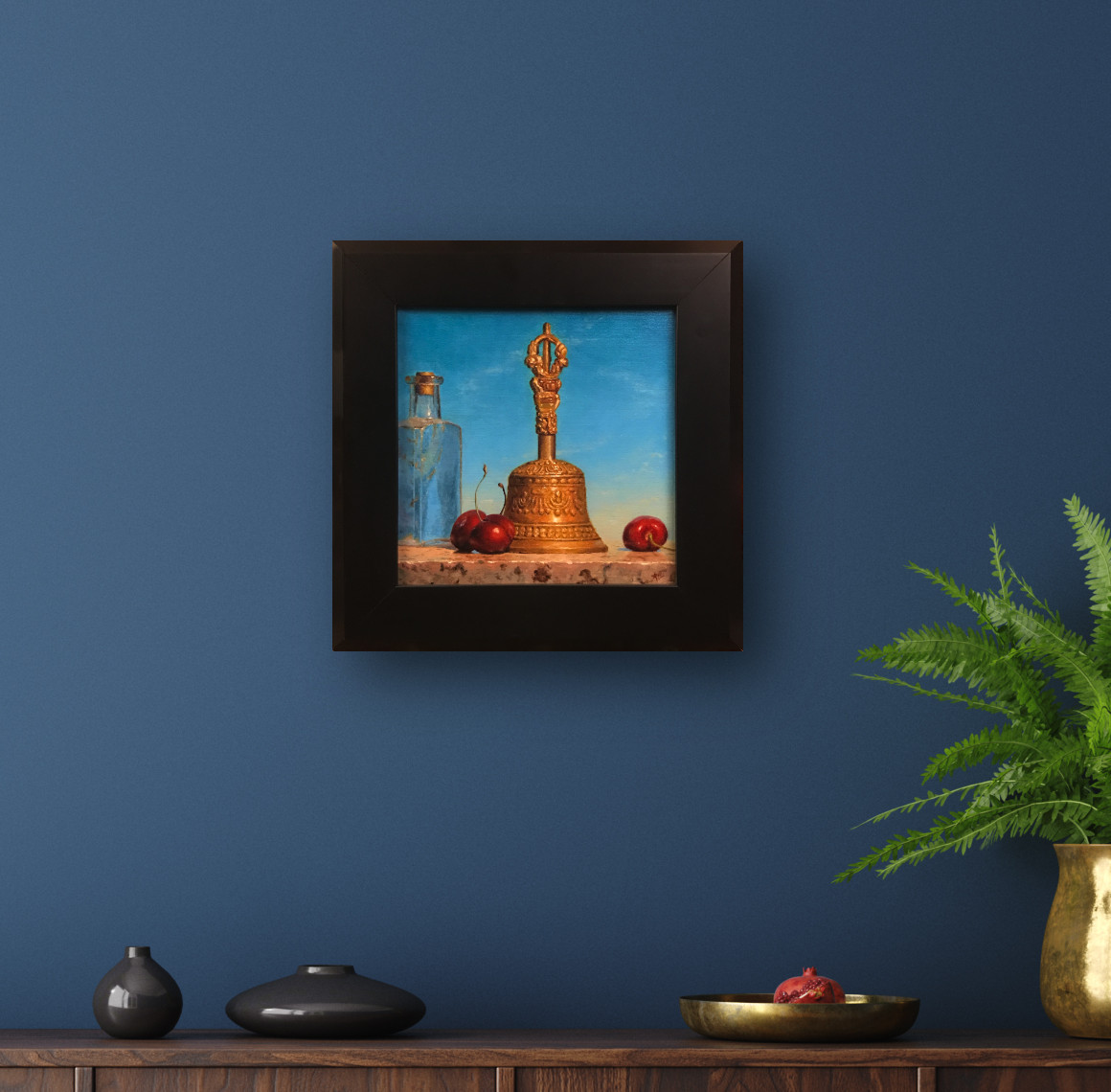 This composition invites the viewer into a moment of elevation and presence. At its center stands a Tibetan bell—ornate, luminous, and still—flanked by ripe cherries and a weathered blue bottle. The background, rather than receding into shadow, opens into radiant sky. The effect is both grounded and expansive: familiar objects held in contemplation against an atmosphere of infinite space.