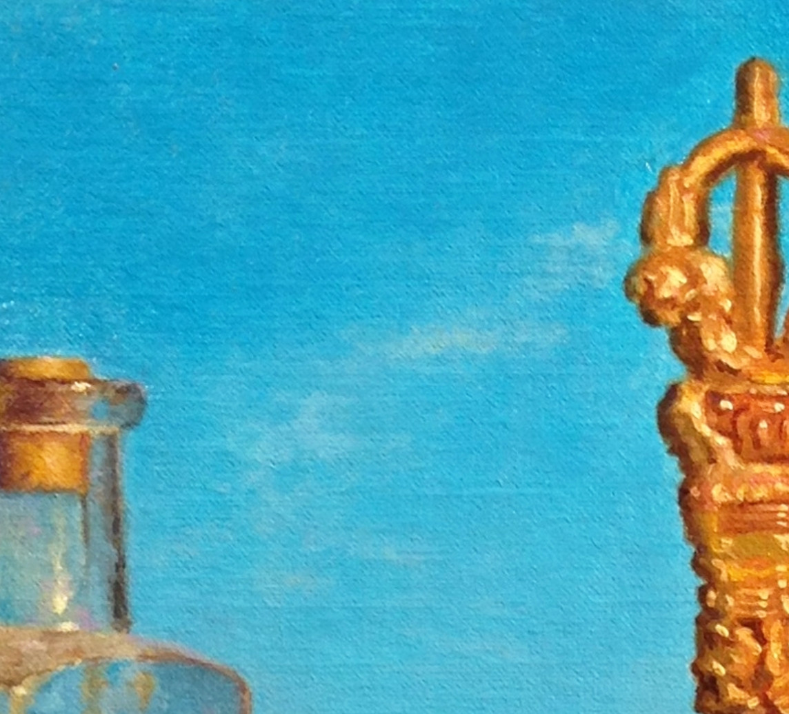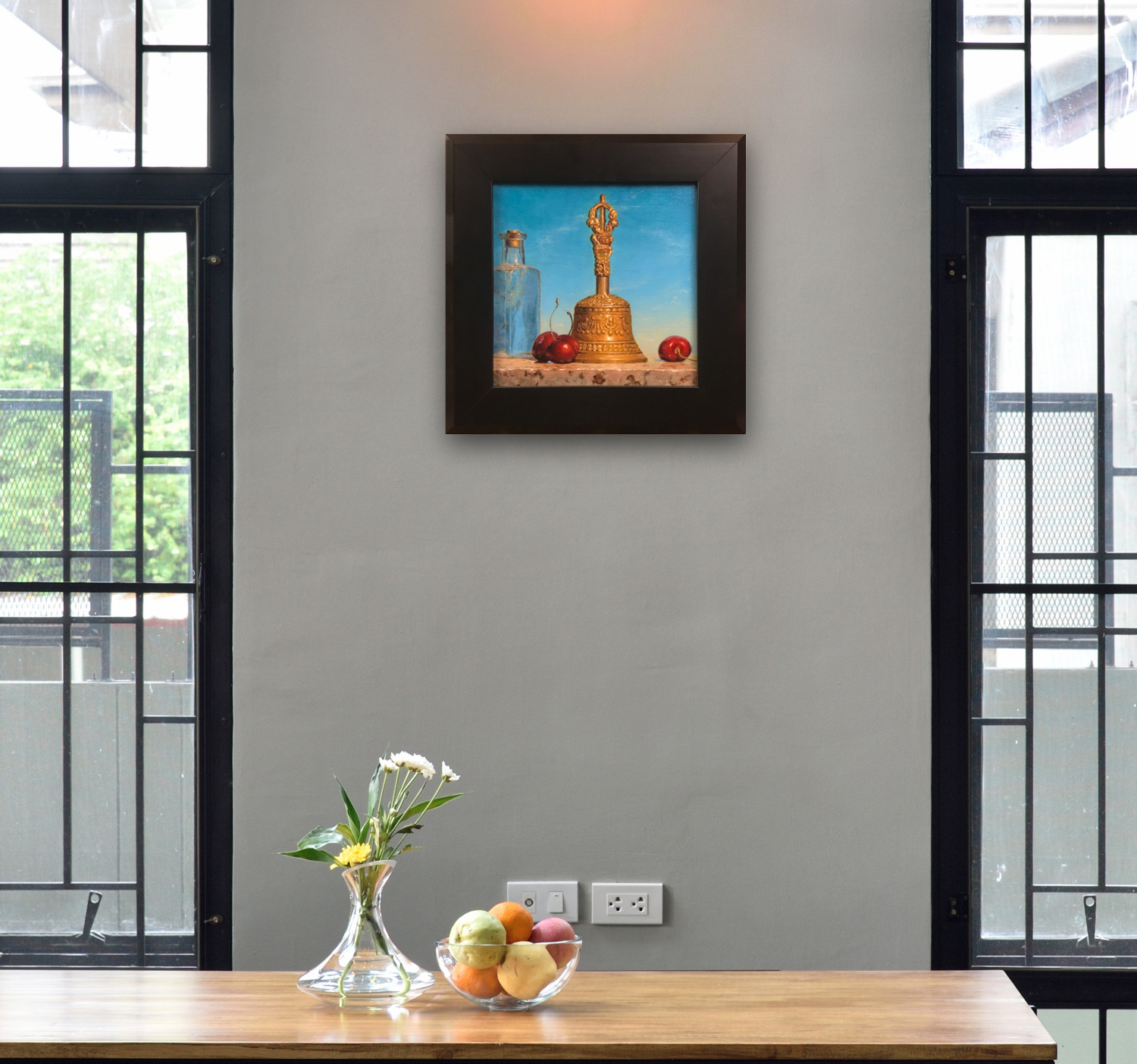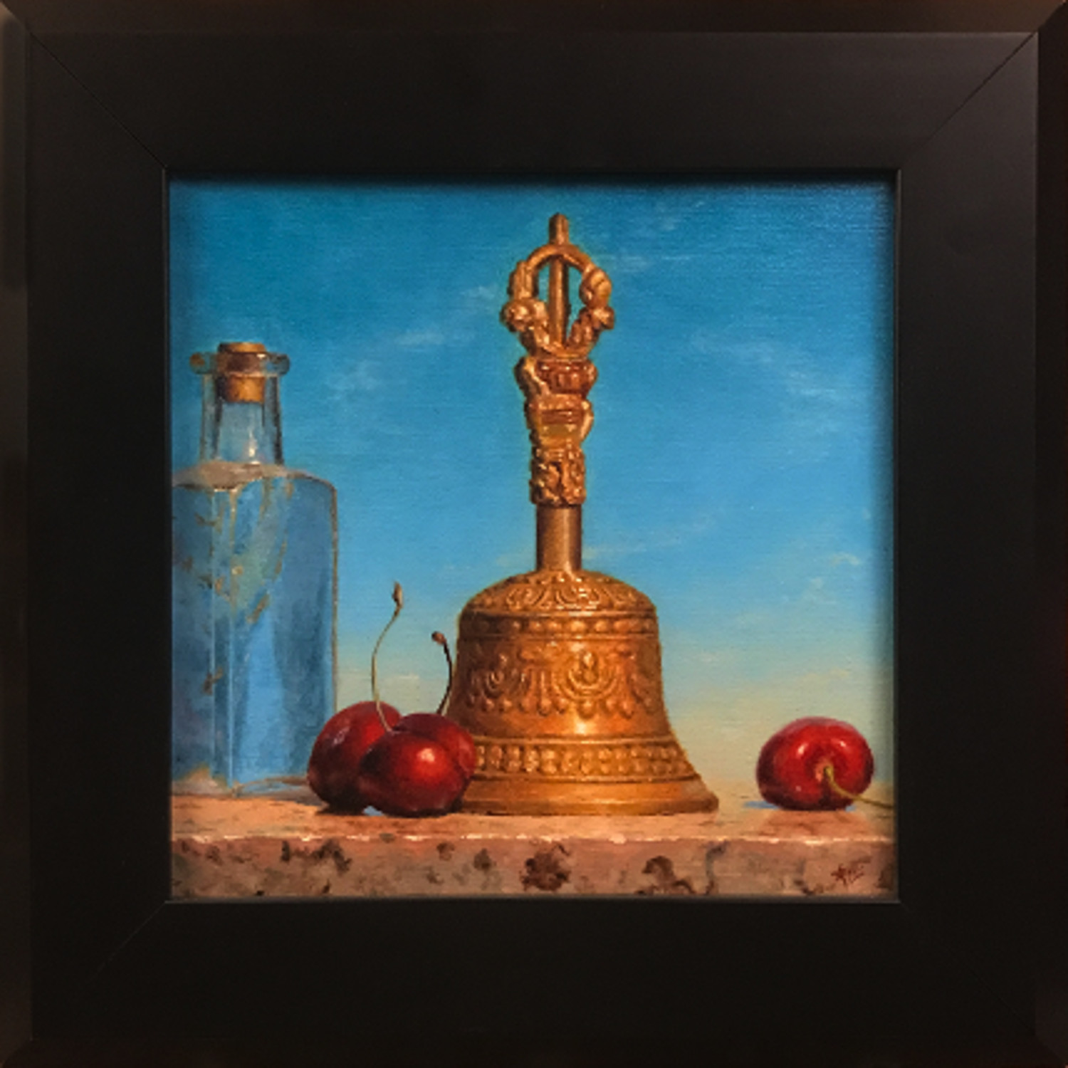 This composition invites the viewer into a moment of elevation and presence. At its center stands a Tibetan bell—ornate, luminous, and still—flanked by ripe cherries and a weathered blue bottle. The background, rather than receding into shadow, opens into radiant sky. The effect is both grounded and expansive: familiar objects held in contemplation against an atmosphere of infinite space.