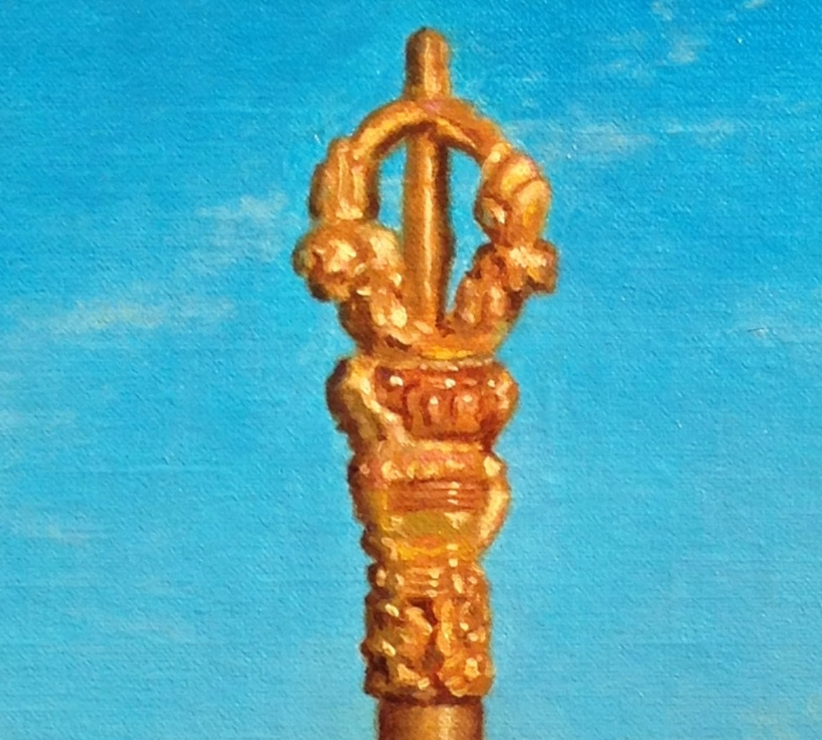 This painting began with a memory—of a Buddhist shrine perched high in the Himalayas, where prayer flags flutter against a cobalt sky and offerings rest on weathered stone.