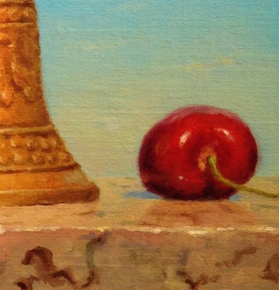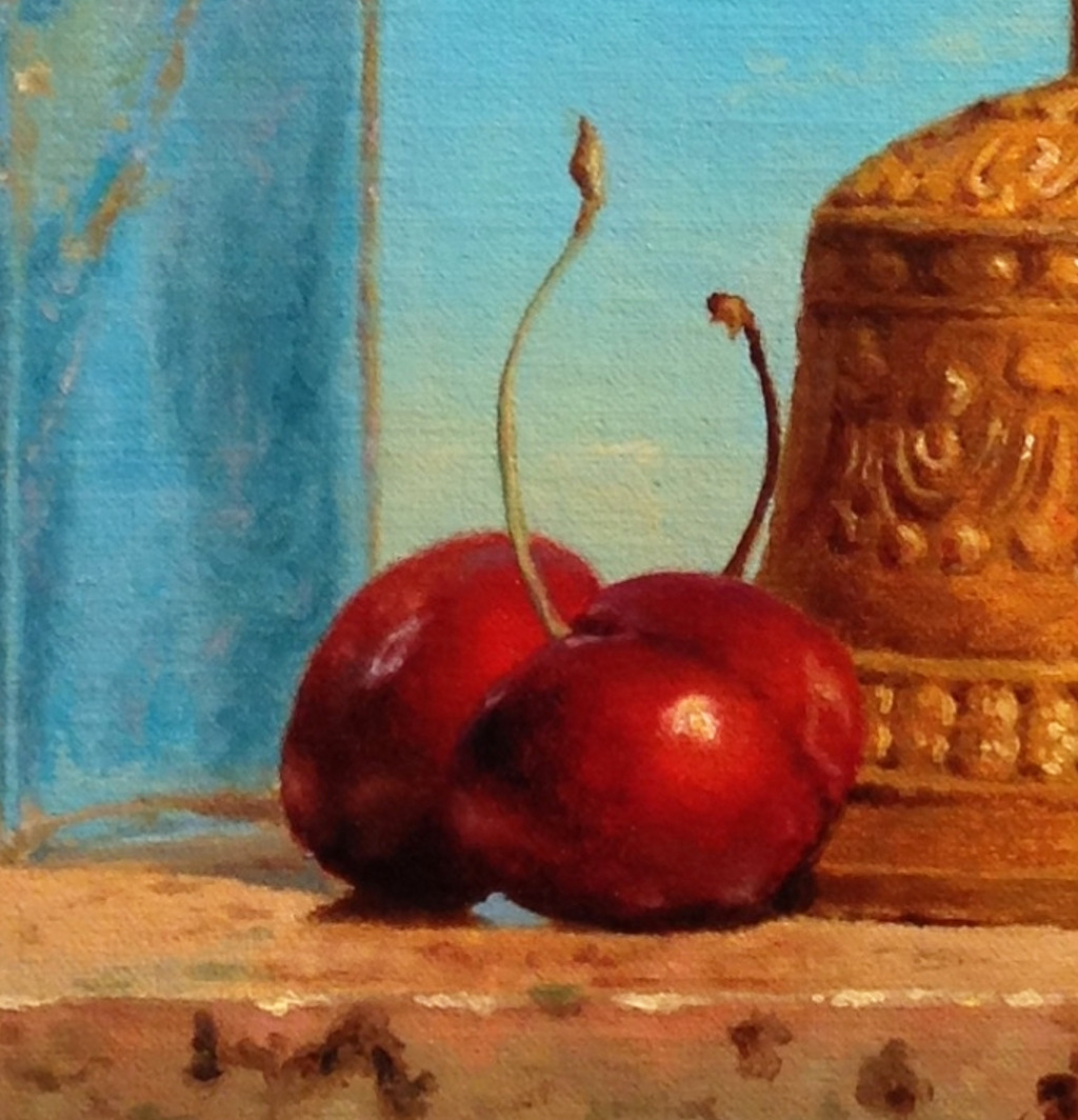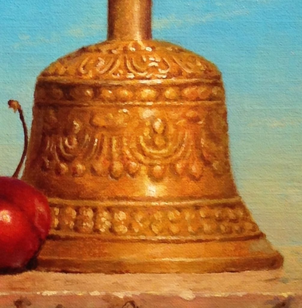 Only the finest oil paints are used, with pigments chosen for their depth, permanence, and historical resonance. Many of the colors in this piece draw on traditions centuries old: the vibrant blue of the sky built in part from genuine Lapis Lazuli, prized since antiquity for its brilliance and rarity. The deep reds of the cherries and the radiant golds of the bell are layered slowly, allowing each glaze to breathe and settle before the next is applied.