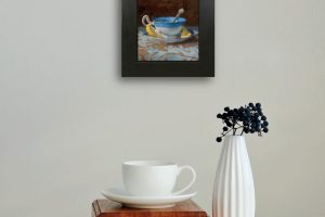 “Blue Teacup with Lemon Wedges” is an original still life painting, done with oil on panel.