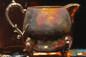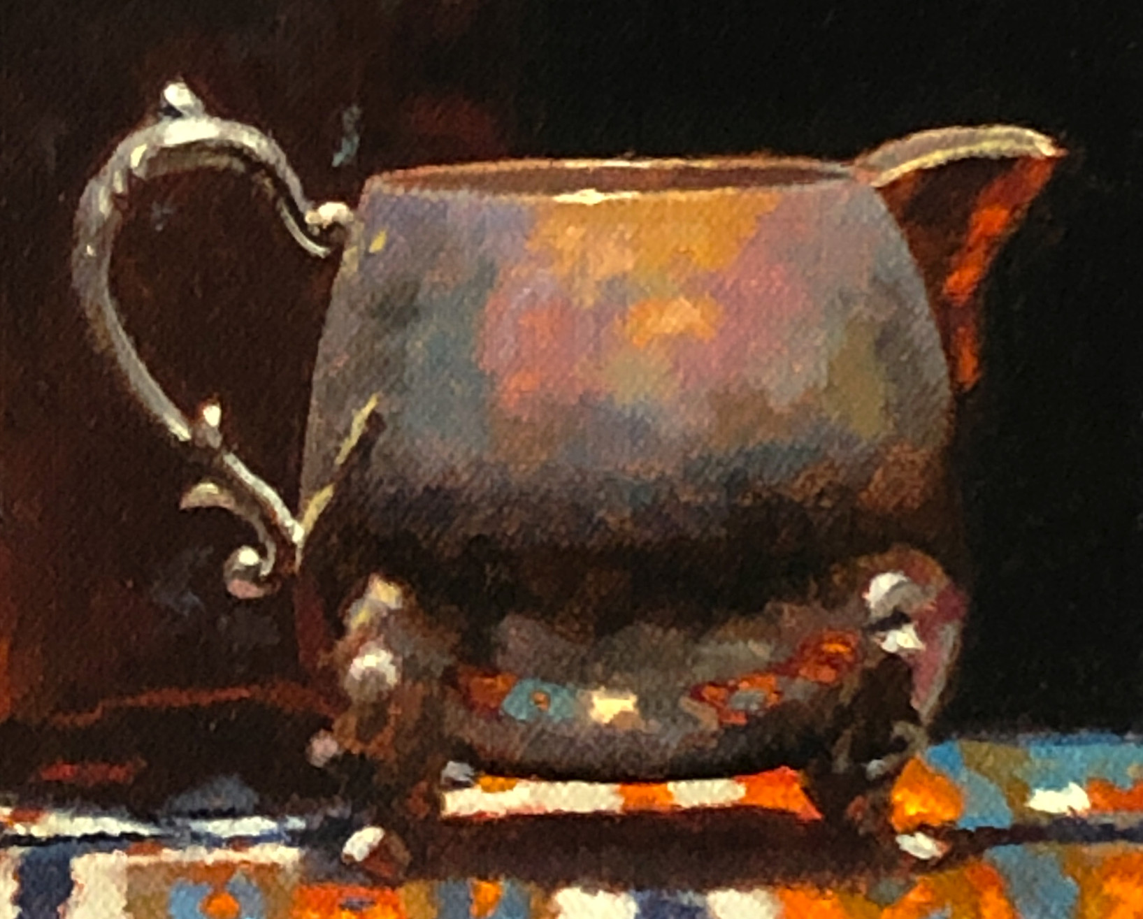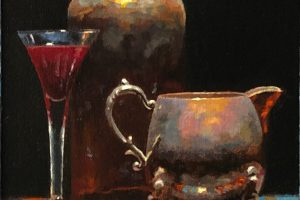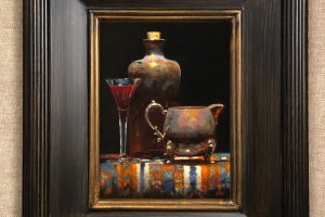 “Bottle, Silver, Elixir” is an original still life painting, done with oil on linen on panel.