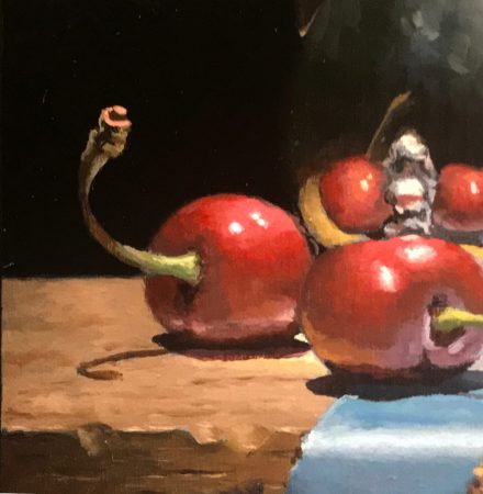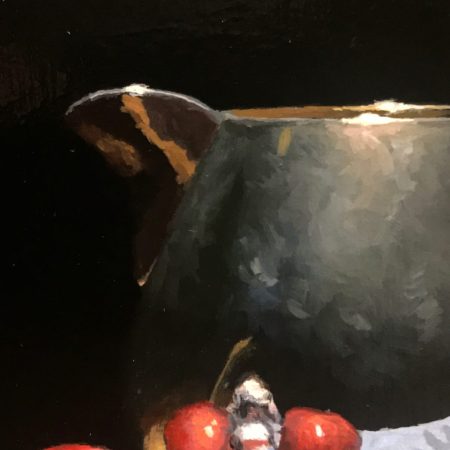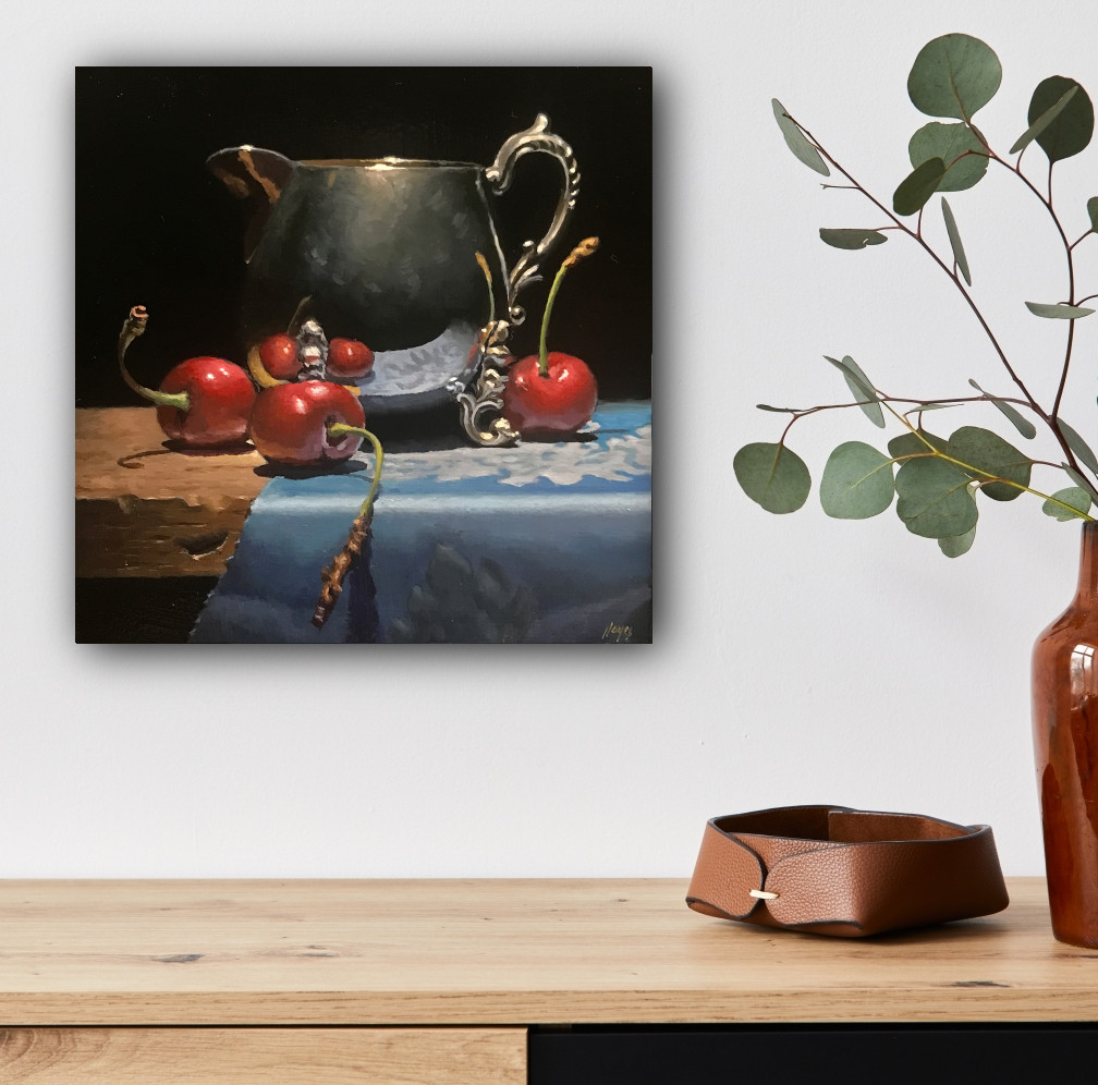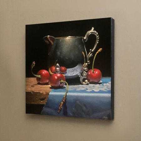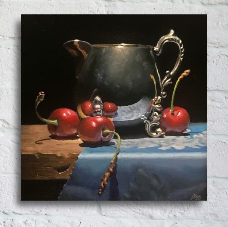 “Cherries and Silver” captures a calm, introspective moment of time; an antique silver creamer surrounded by fresh red cherries resting on a piece of blue silk.