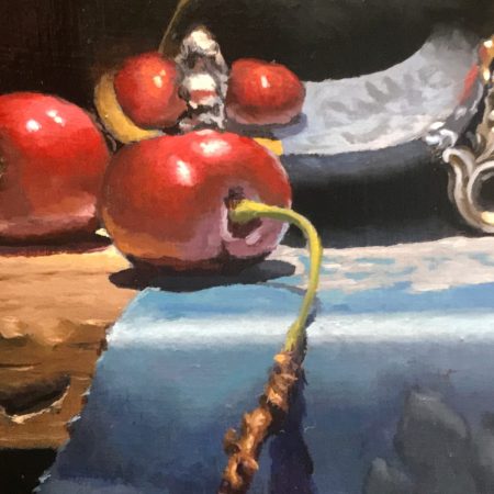 “Cherries and Silver” captures a calm, introspective moment of time; an antique silver creamer surrounded by fresh red cherries resting on a piece of blue silk.