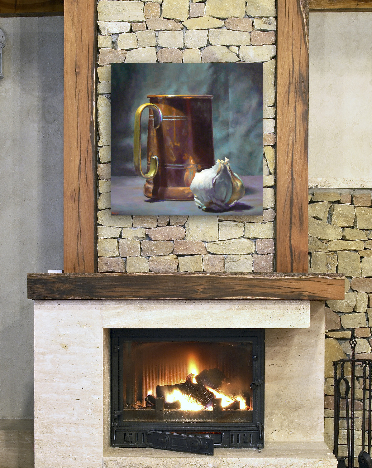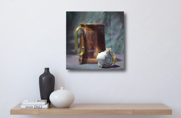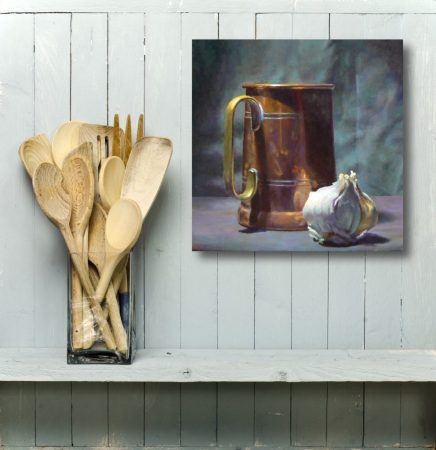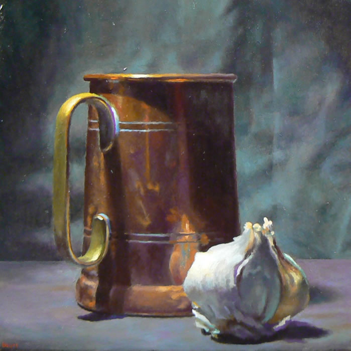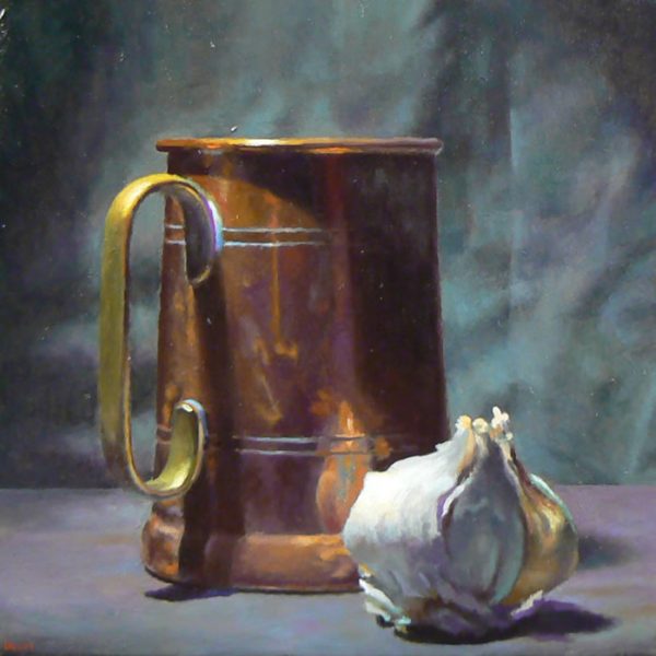 “Copper and Garlic” is a simple pairing of two humble objects; an antique copper tankard and a clove of garlic.