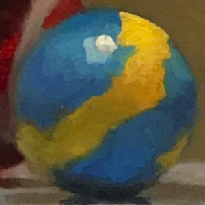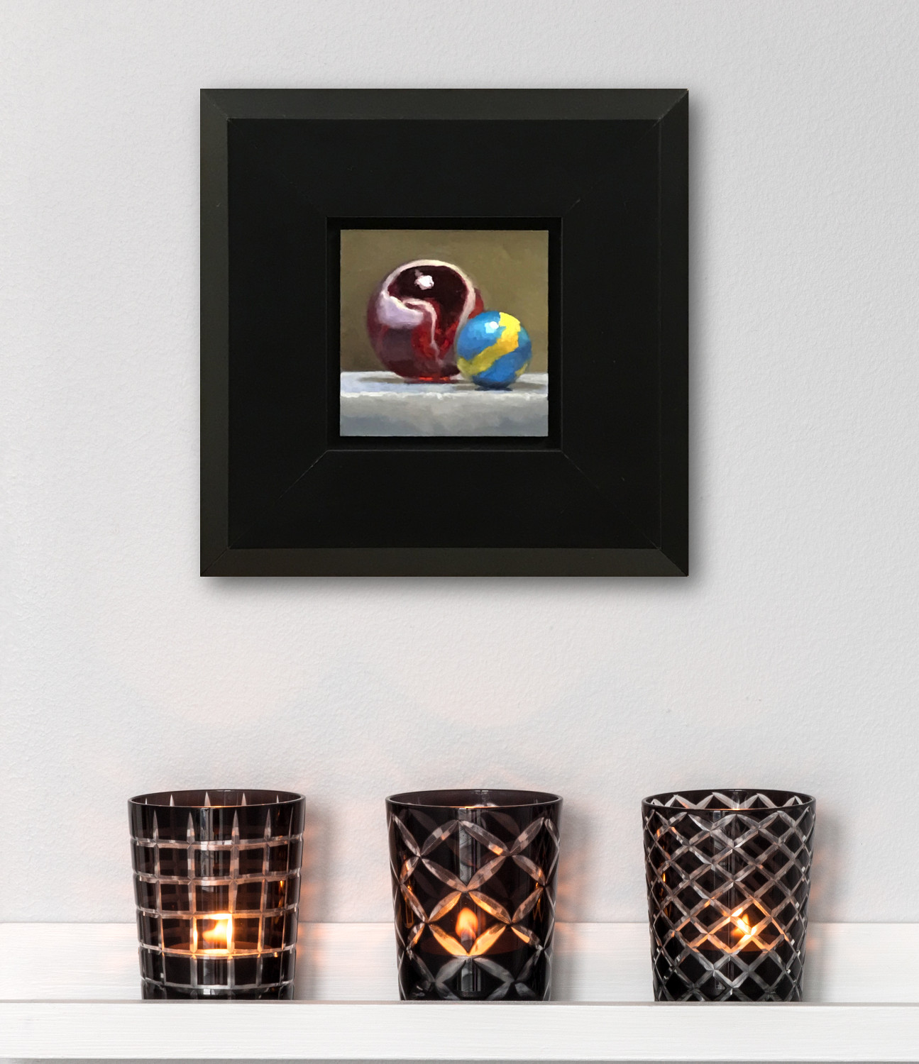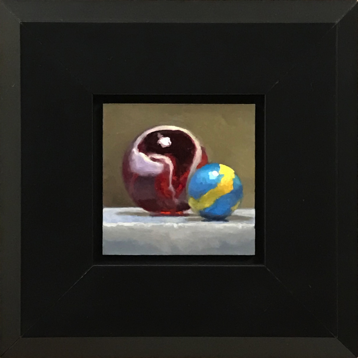 “Couple No. 1” is a quiet, playful exploration of connection, captured through the simple yet evocative pairing of two marbles. Painted in oil on panel, this intimate composition reflects the nature of relationships—the closeness, the individuality, and the subtle dynamics of being together.
