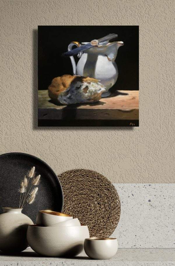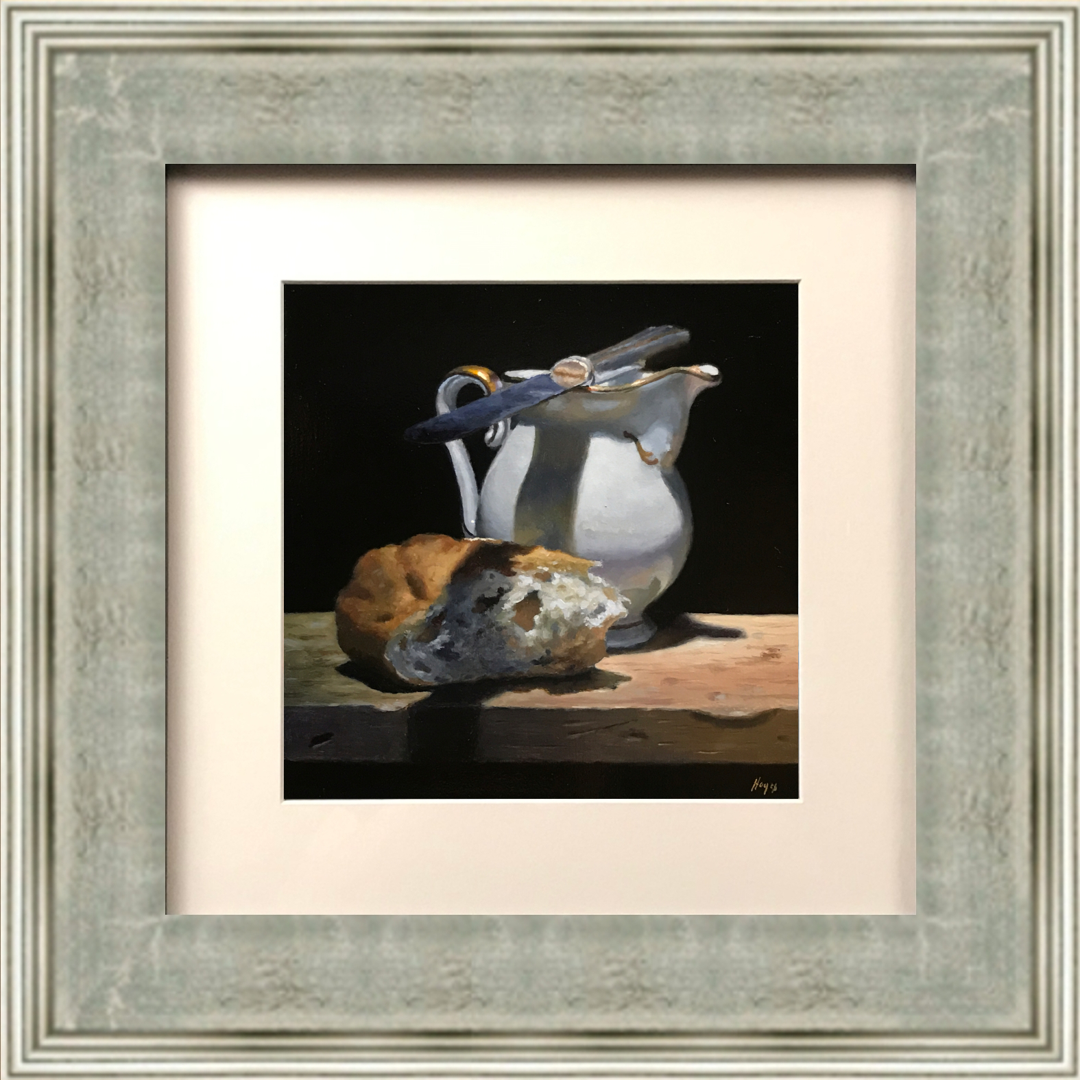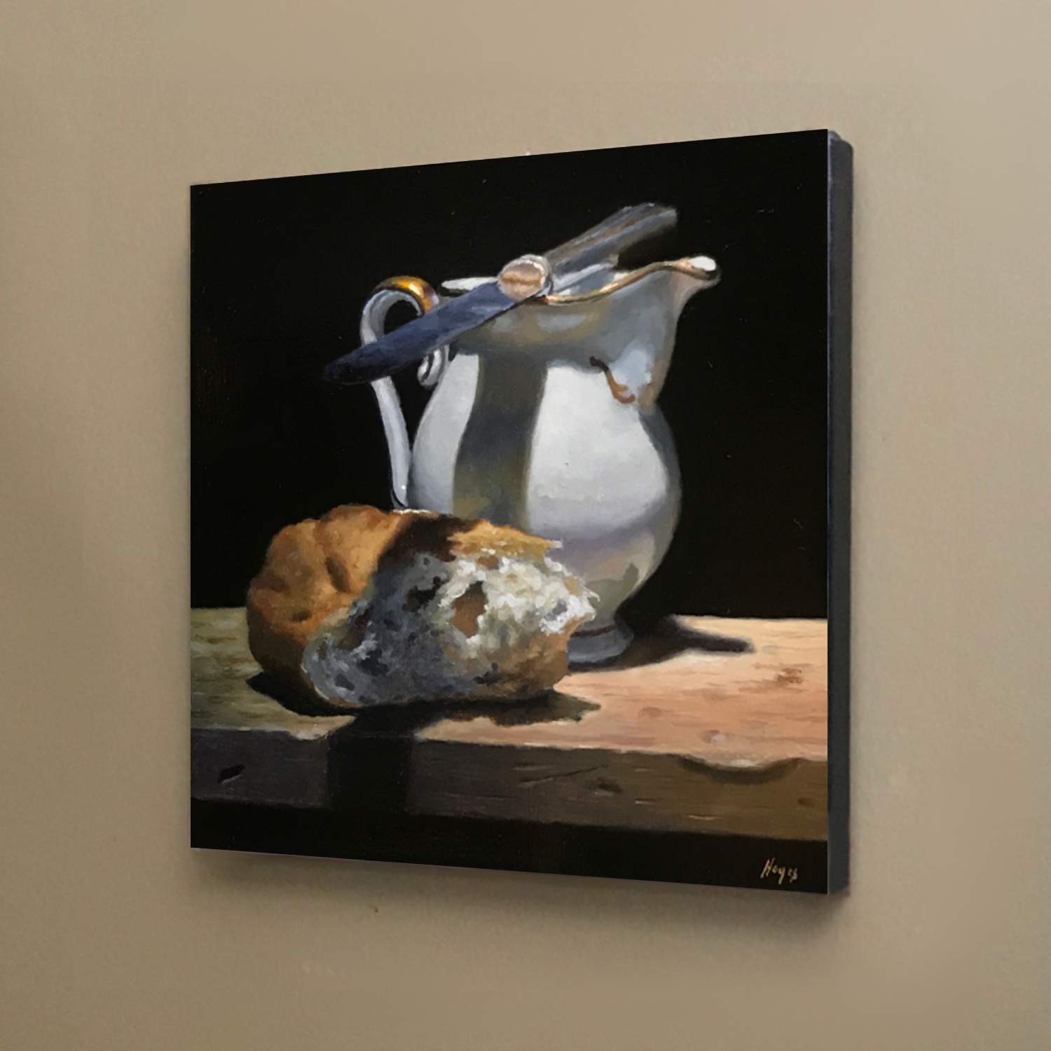 “Creamer, Knife, Bread” by Jeffrey Hayes captures a silent gentle moment of time; an antique silver knife rests on a porcelain creamer, and casts a dramatic shadow across the creamer and a crust of fresh bread.
