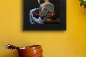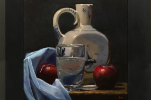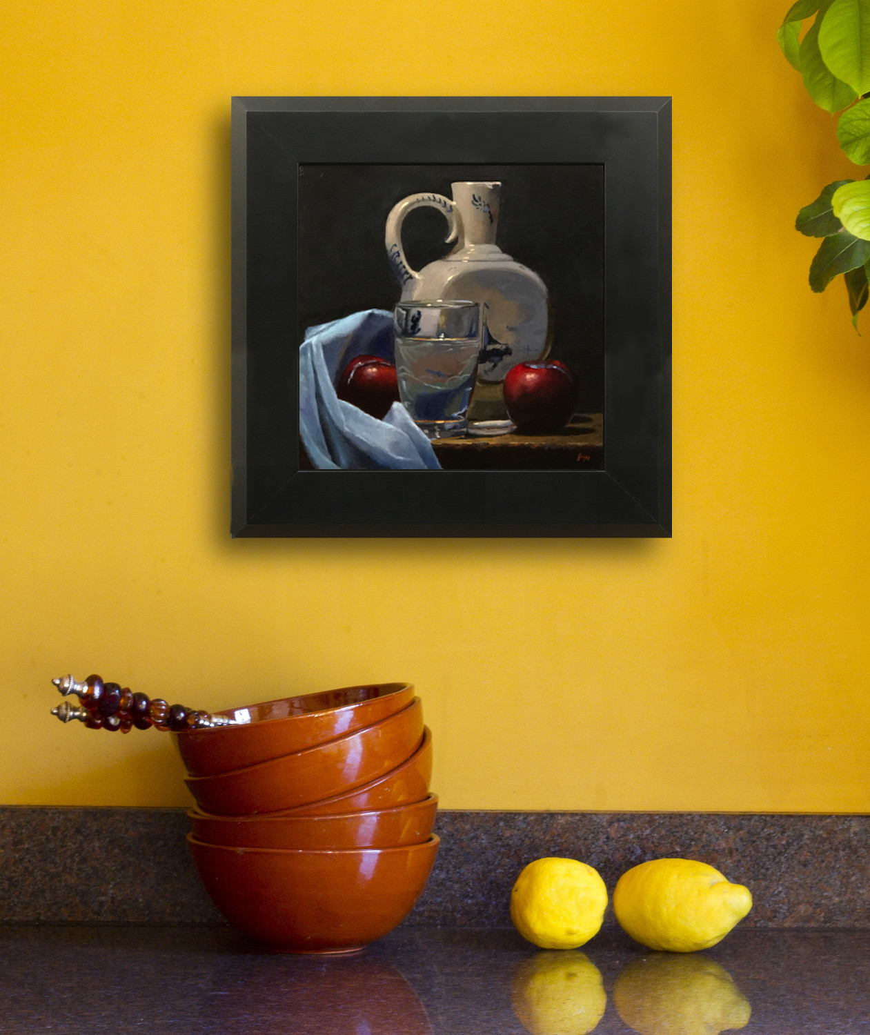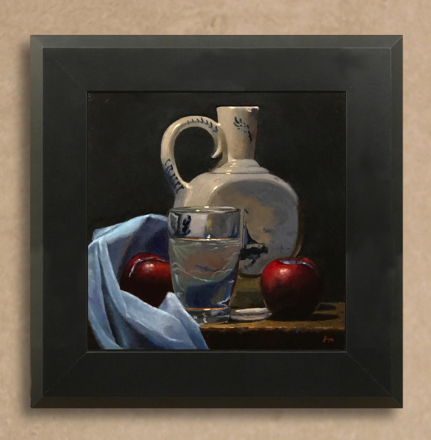 “Delft Pitcher, Water Glass, Plums” is an original still life painting, done with oil on panel.
