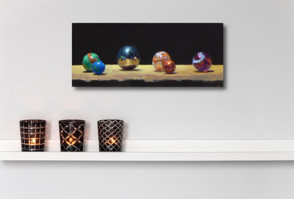 “Forum No. 9” at once is a still life of marbles, and a playful painting – imagining small crowds come together to discuss and debate.