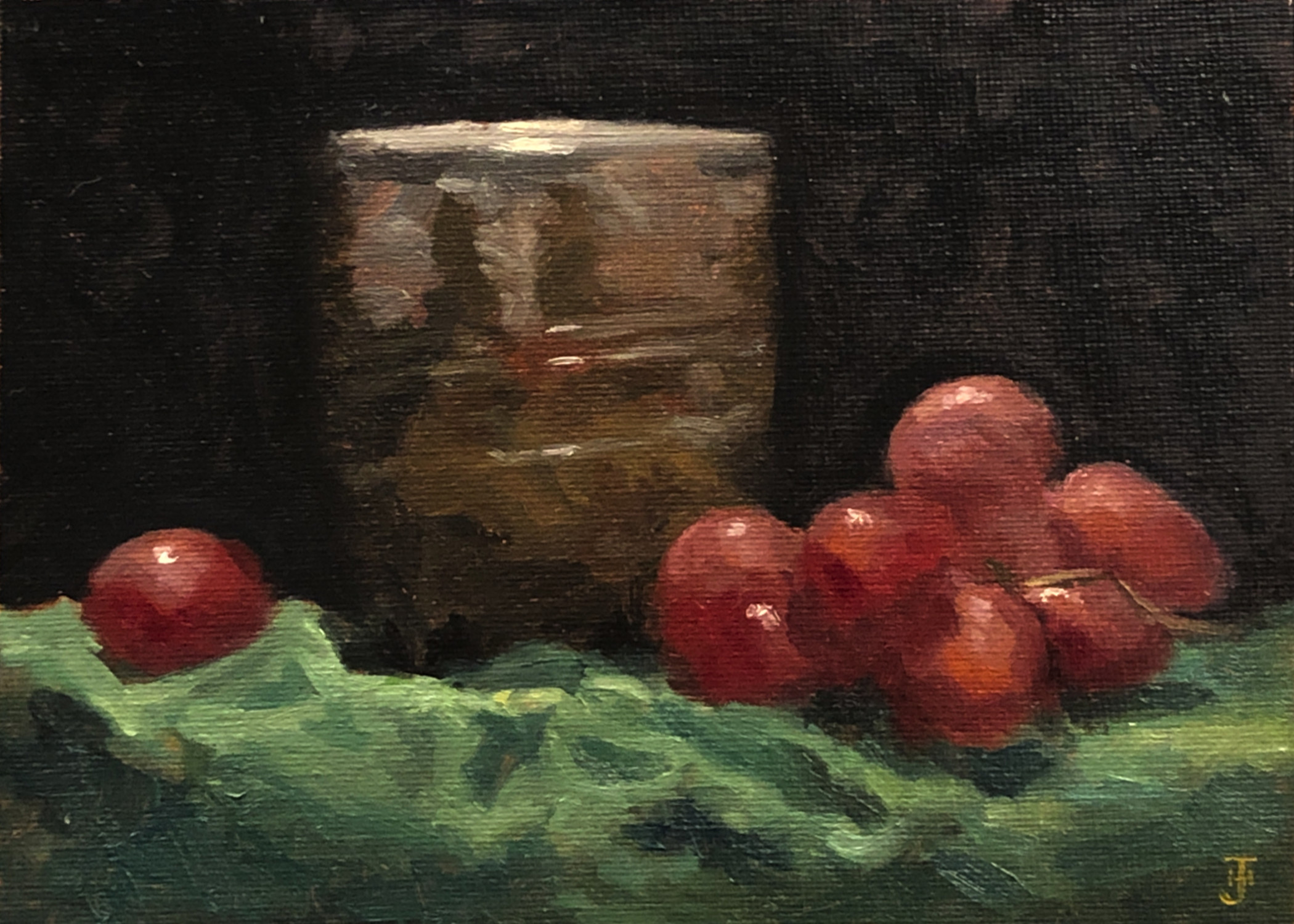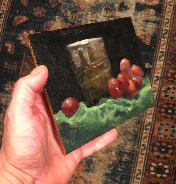 “Handmade Sake Cup and Grapes” is an original oil sketch, done on canvas panel.