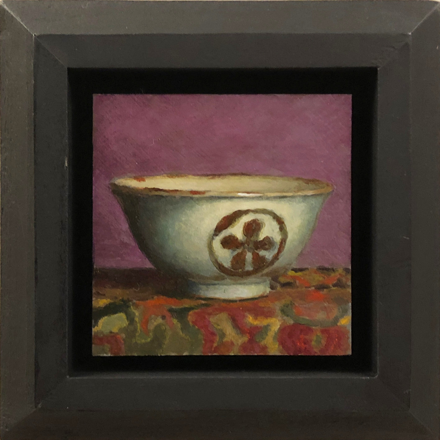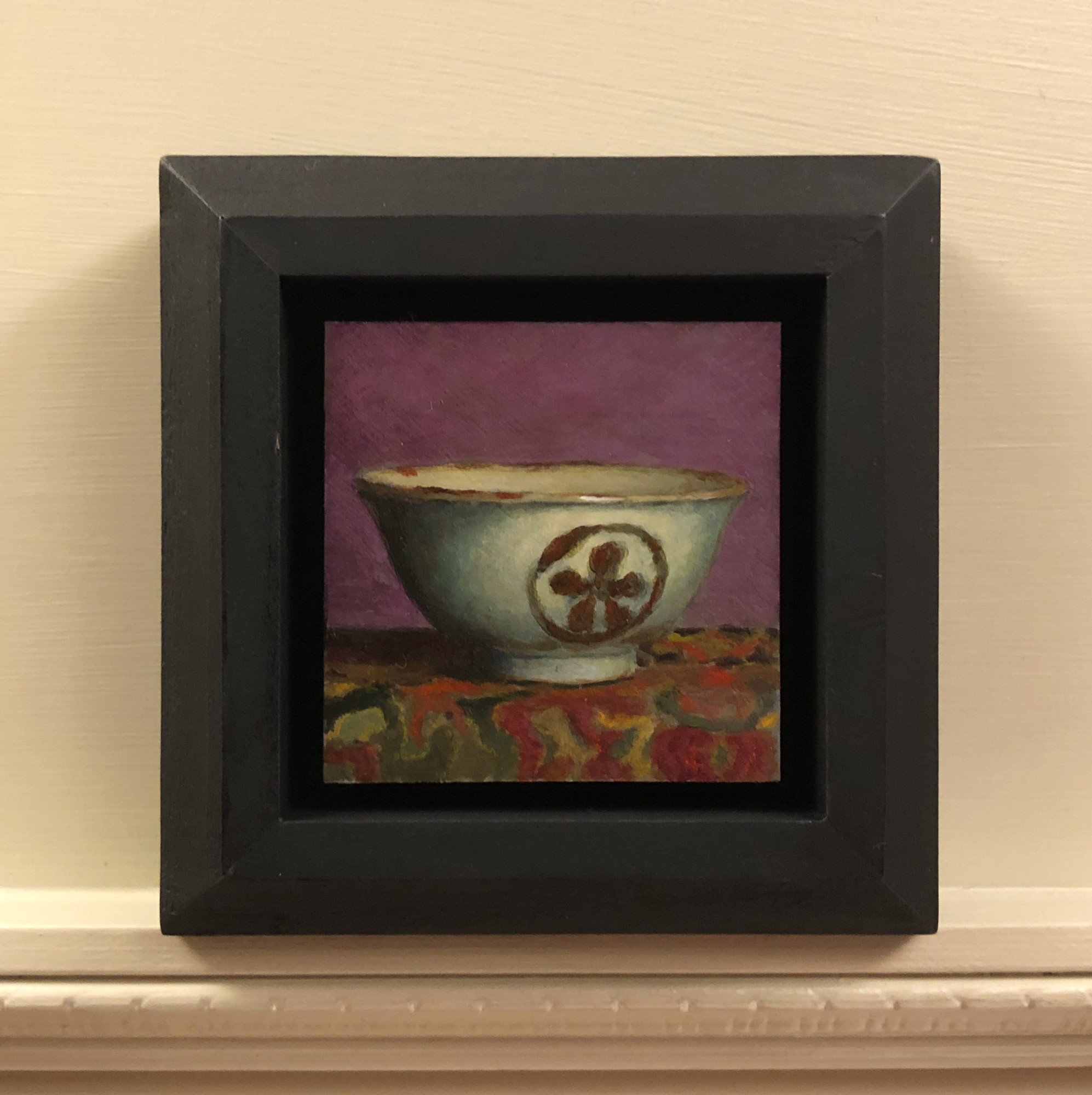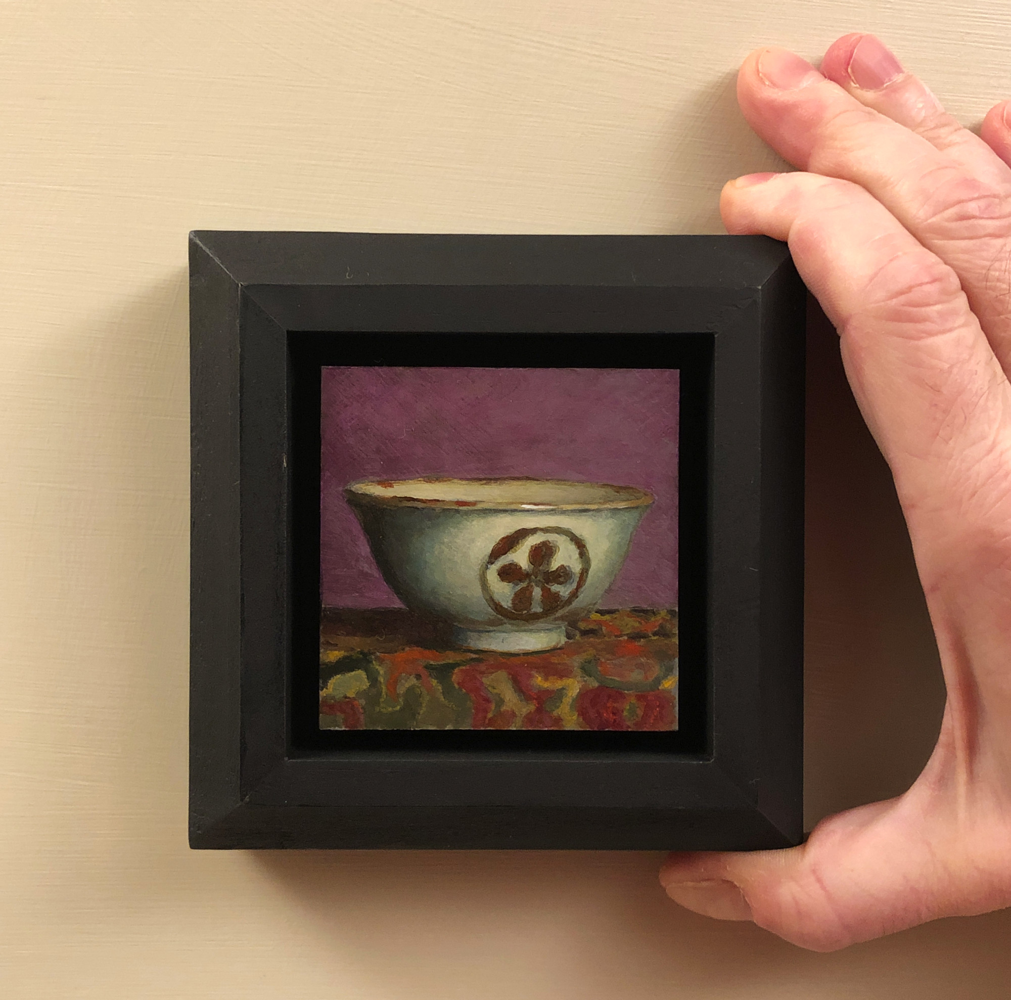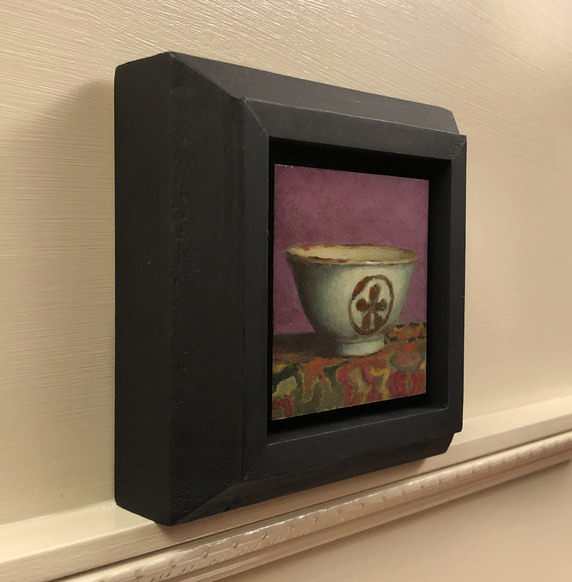 “Handmade Teacup Against Violet” is a 3×3-inch acrylic painting that captures the quiet beauty of simplicity and craftsmanship. Framed in a handmade black setting with steeply beveled sides, the painting appears to float within a window of light and shadow. The 4.5×4.5-inch outer dimensions create a striking presentation, enhancing the richness of the details while lending the piece an understated elegance.