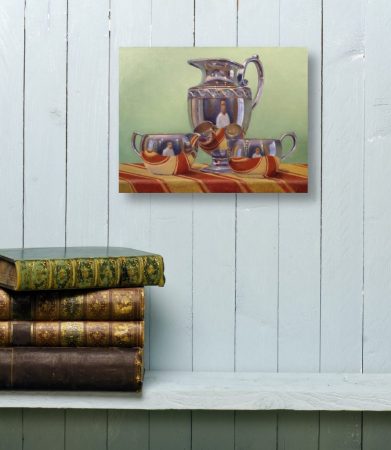 “Head and Shoulders” is a triple self portrait seen in 3 pieces of silver. Also reflected are parts of my studio and a view out the window to a snowy winter day.