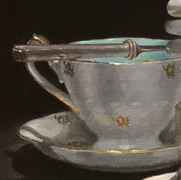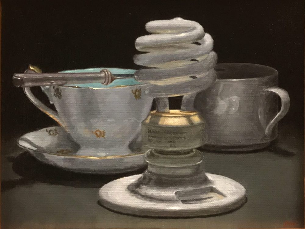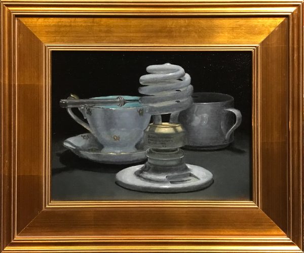 This composition brings together a porcelain teacup, a pewter mug, a silver spoon, and a spiral compact fluorescent bulb—objects from different eras placed in quiet conversation. Each form is rendered with precision and care, unified by their interplay of curves, surfaces, and light.