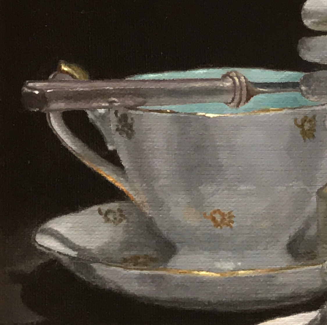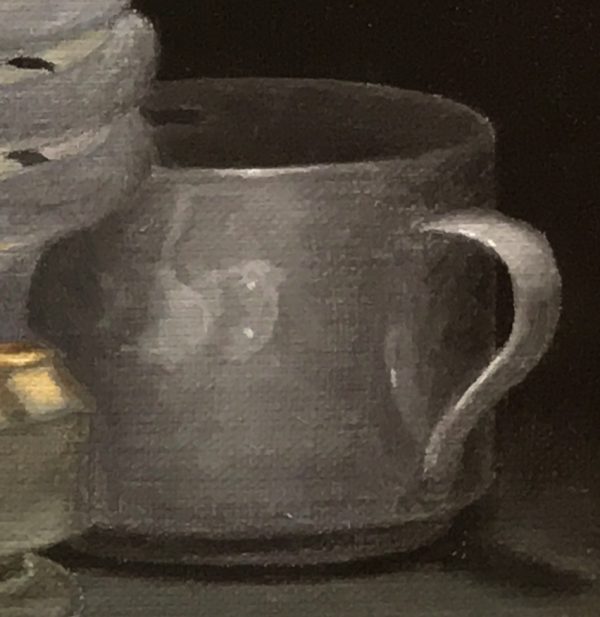 Over this dry foundation, layers of oil paint were added in translucent glazes and more opaque passages, depending on the surface being described. The gleam of porcelain, the diffuse softness of ceramic, and the matte finish of the unusual central object were each approached with a unique touch. Every shift in light and surface was rendered with intention.