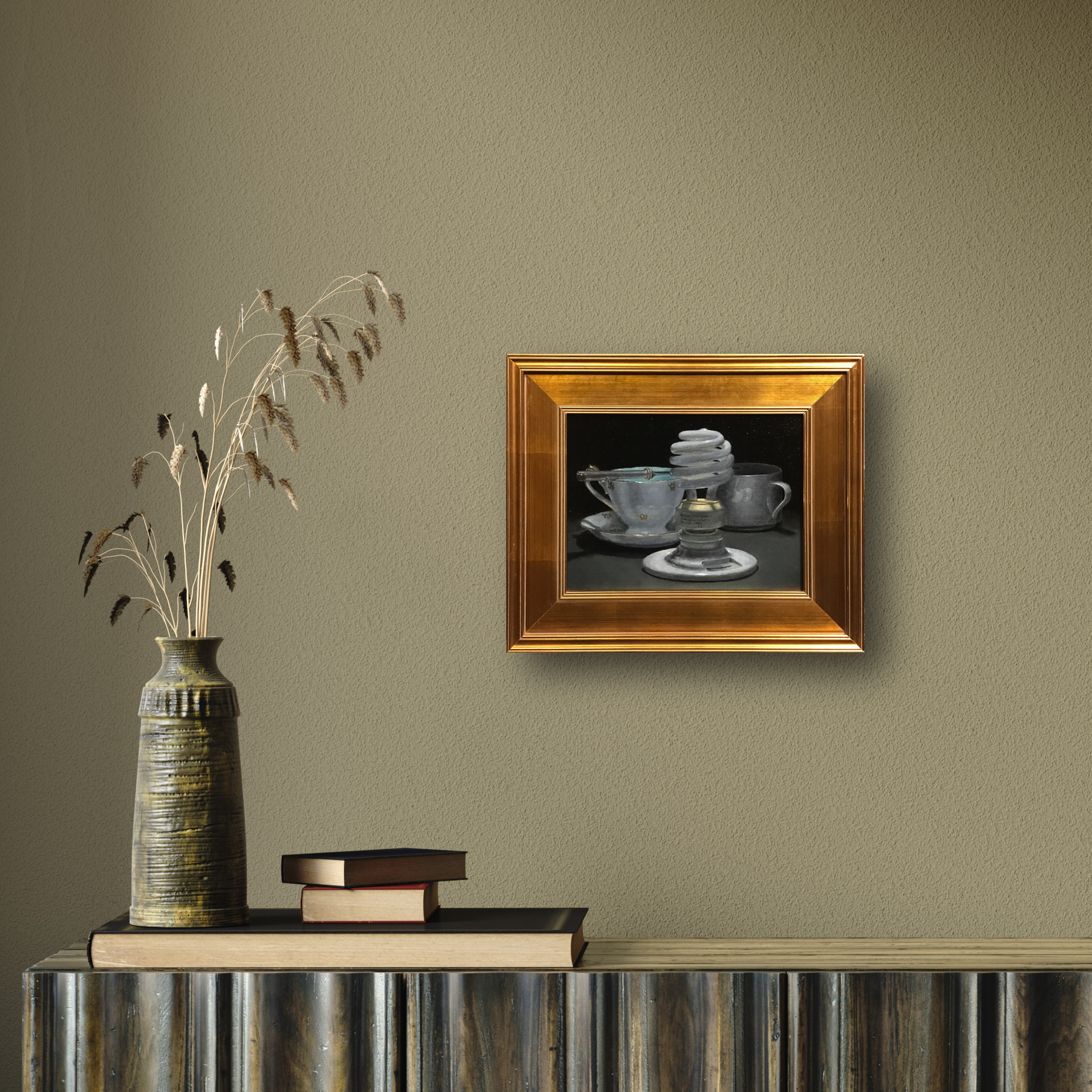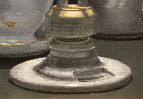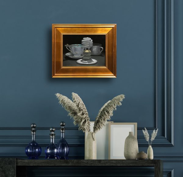 From the cool metallic glint of the lightbulb base to the warm luster of antique porcelain, every surface was painted with attention to both texture and tone. The materials used are not merely functional—they’re an extension of the visual language, enabling the painter to convey subtle shifts in light, weight, and atmosphere with precision and sensitivity.