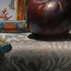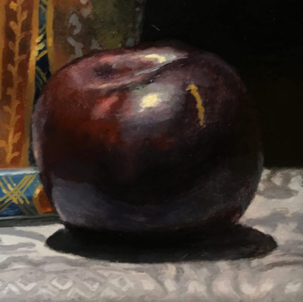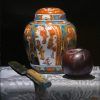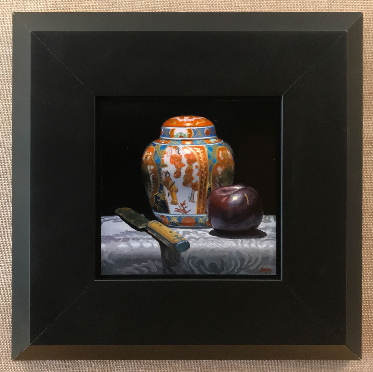 “Knife, Ginger Jar, Plum” is an original still life painting. It features an antique wood-handled knife, hand-painted Chinese ginger jar, and a fresh plum. The entire composition rests on a brocaded silk cloth.