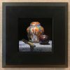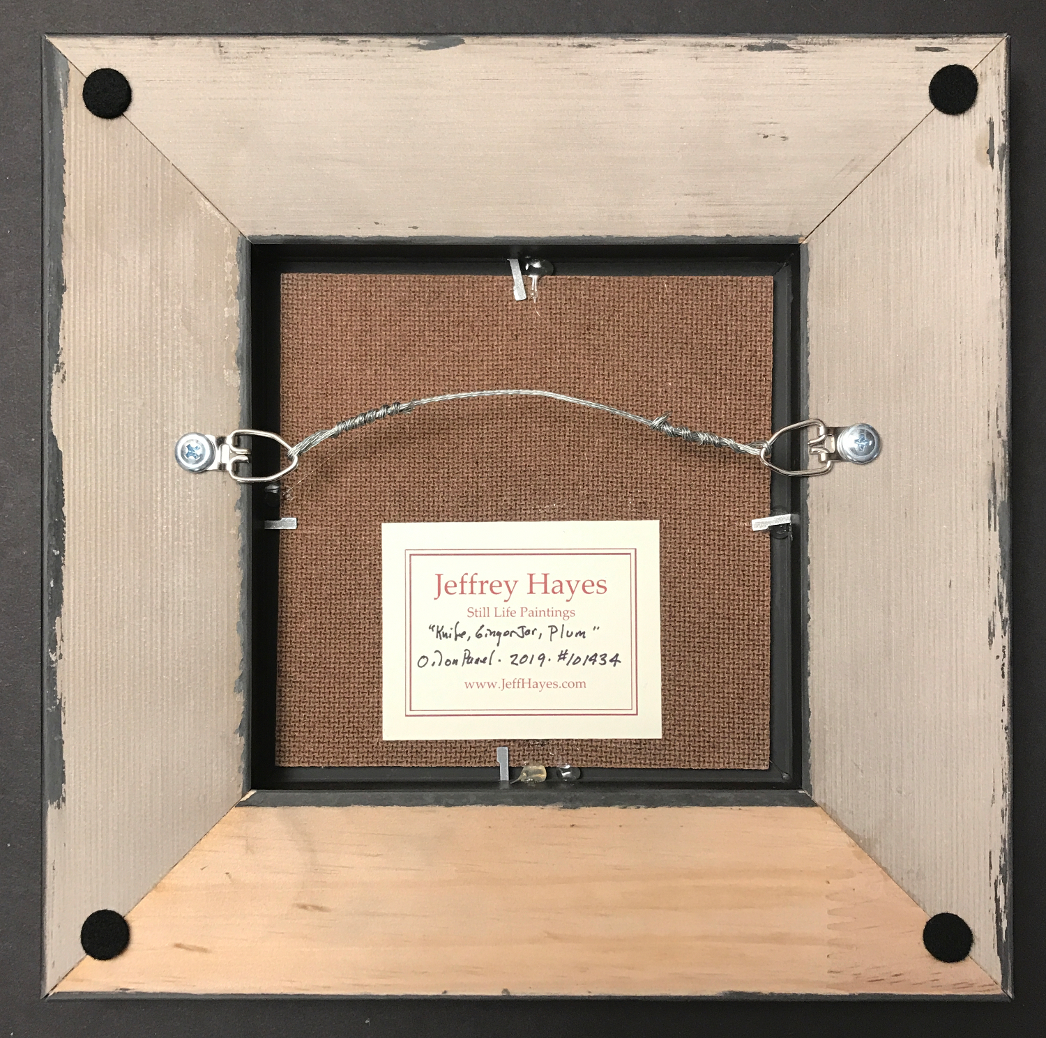 “Knife, Ginger Jar, Plum” measures 5 x 5 inches (12 x 12 cm), and is presented in a flat panel black frame with a beveled edge. The outer dimensions of the frame are 11 x 11 inches (28 x 28 cm). Felt pads are affixed to each corner of the back of the frame to prevent any damage to your wall and to ensure that the painting rests perfectly parallel to the wall.