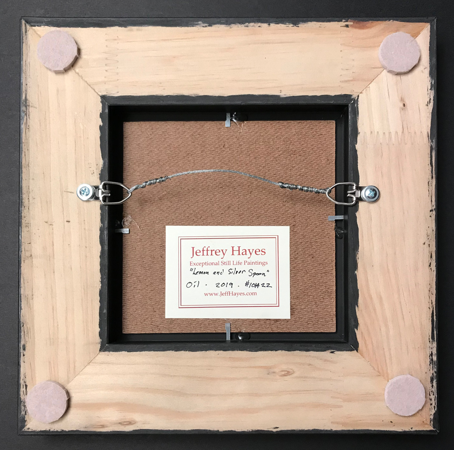 “Lemon and Silver Spoon” measures 5 x 5 inches (12 x 12 cm), and is presented in a flat panel black frame with a beveled edge. The outer dimensions of the frame are 11 x 11 inches (28 x 28 cm). Felt pads are affixed to each corner of the back of the frame to prevent any damage to your wall and to ensure that the painting rests perfectly parallel to the wall.