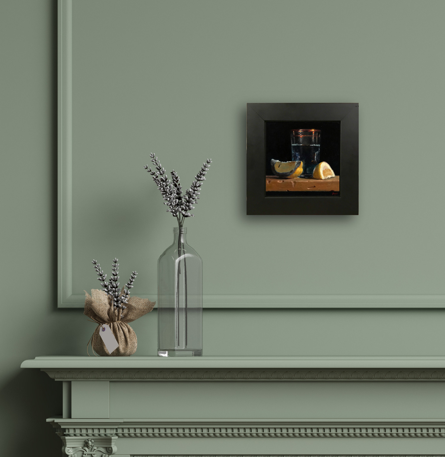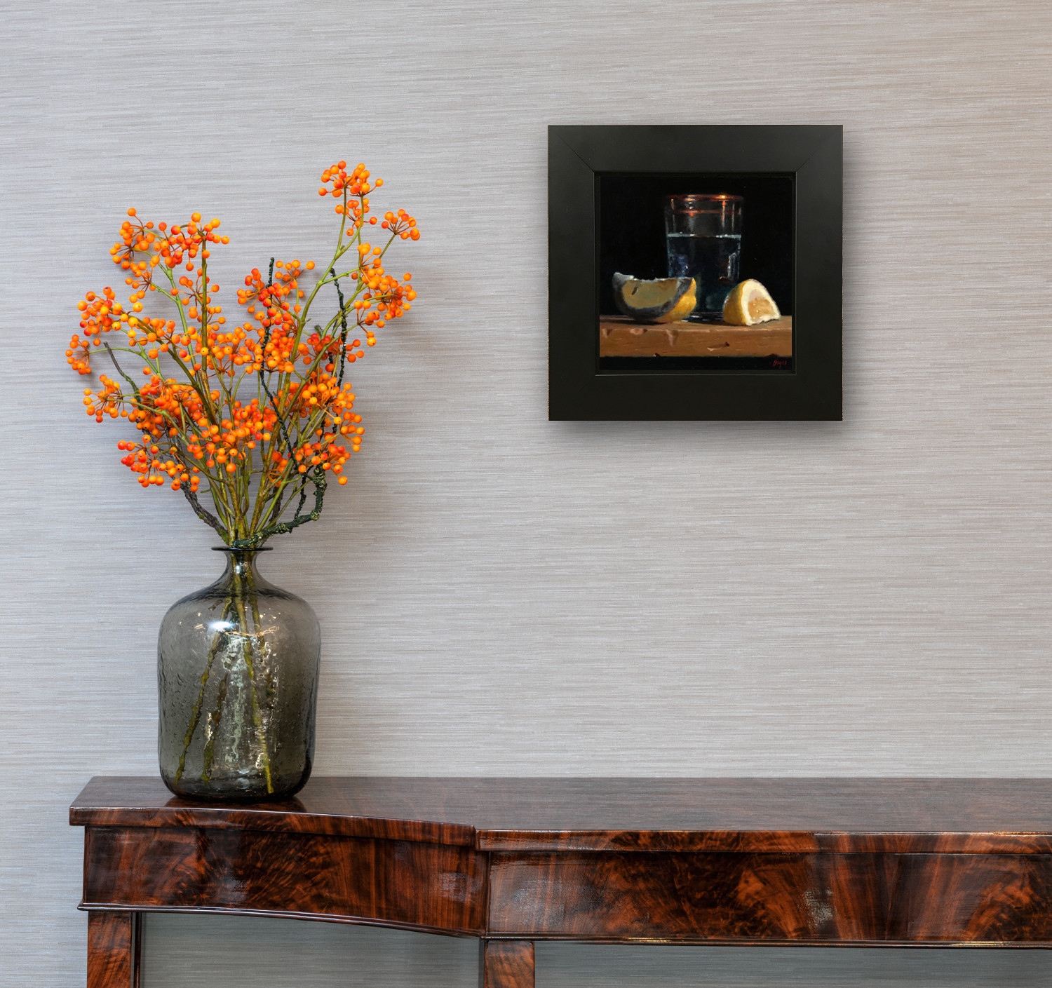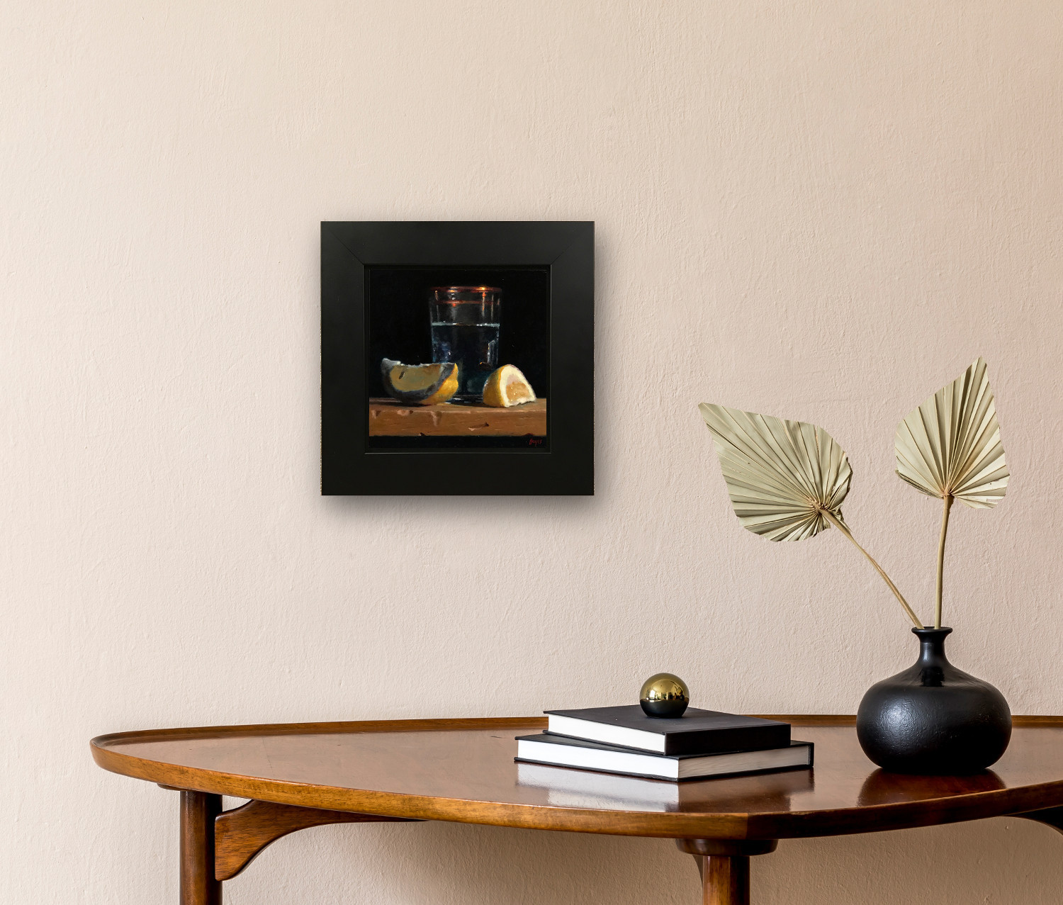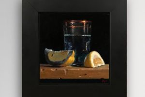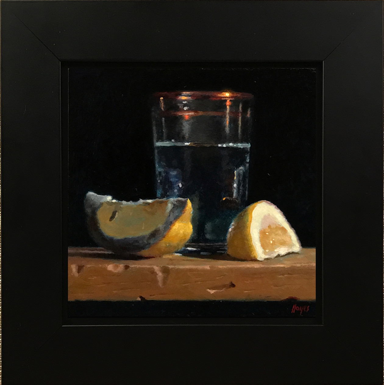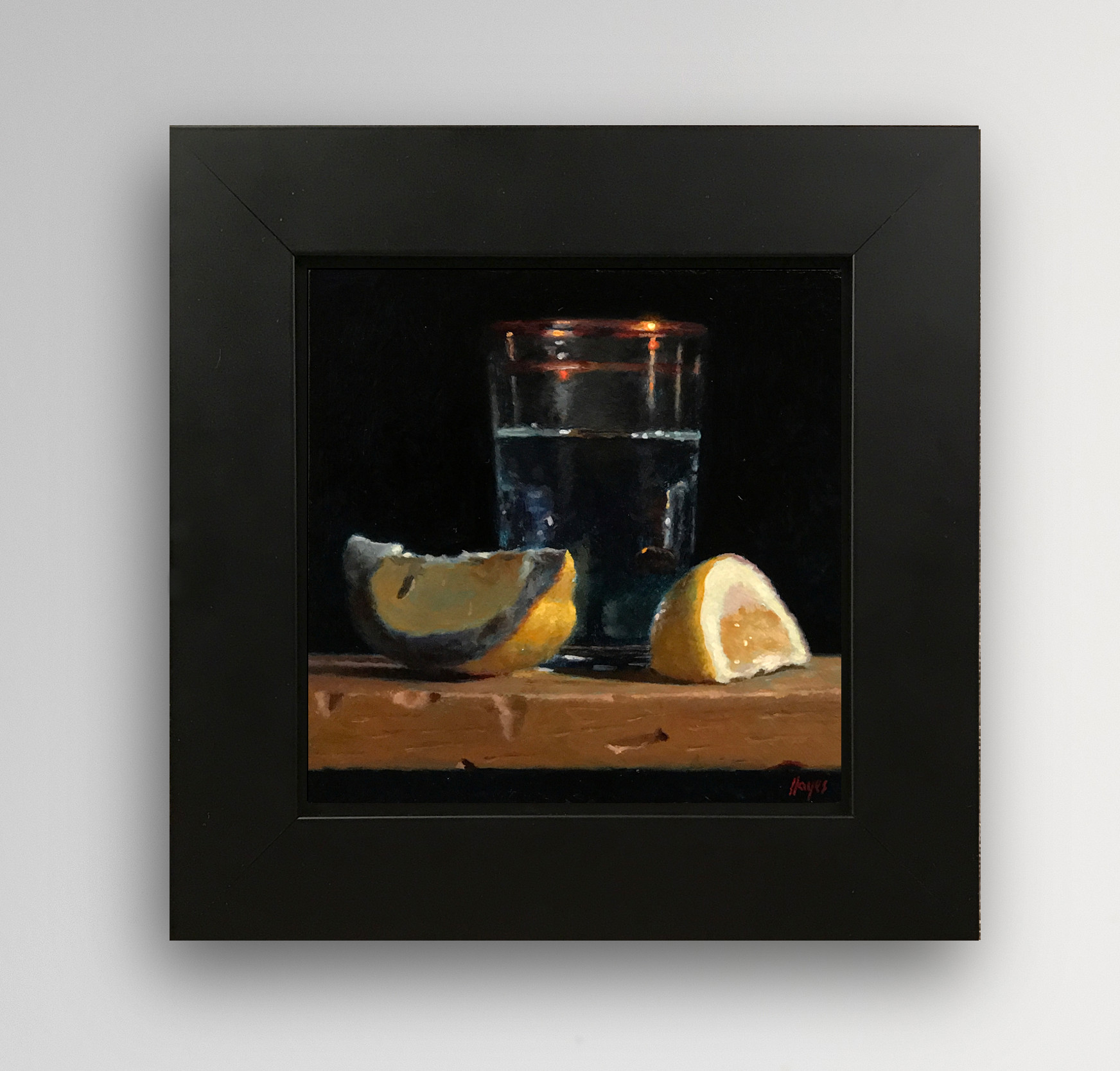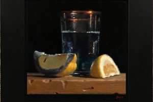 “Lemon Slices and Water Glass” is an original still life painting, done with oil on panel.