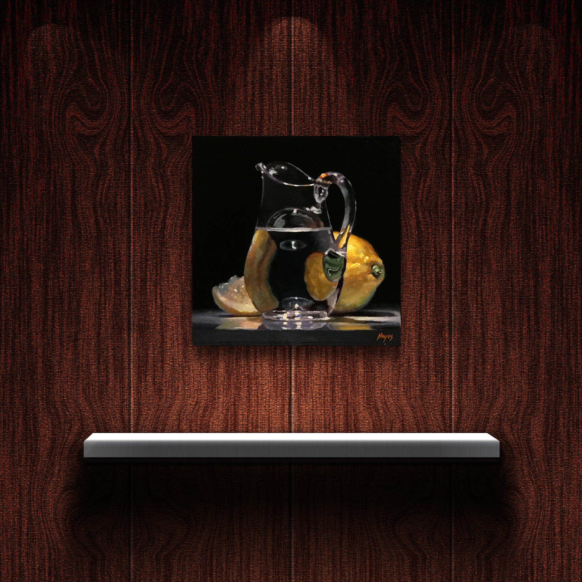 “Lemons and Glass Creamer” captures a moment of deep silence as a dramatic beam of light shines down on a glass creamer, which bends and reflects the lemons behind it.