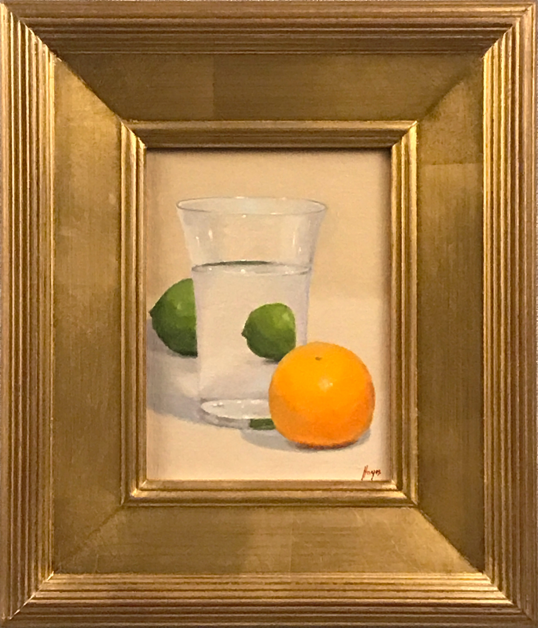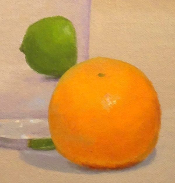 “Lime, Glass, Orange” is an original still life painting, created with oil on linen panel.
