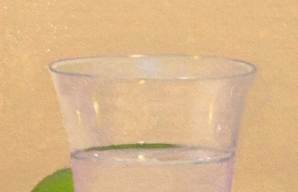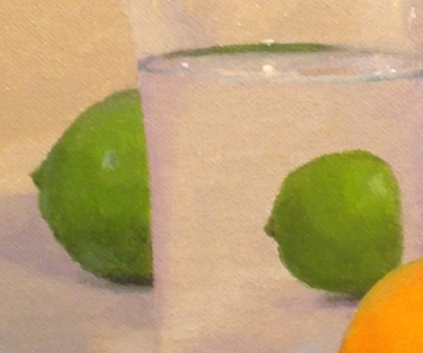 Once the underpainting had cured, layers of translucent color were applied slowly—sometimes as glazes, sometimes as soft scumbles. These layers allow light to penetrate the surface and reflect back through the pigment, producing a quiet luminosity that cannot be achieved with direct application alone. The form of the lime seen through water, in particular, was developed with great care, requiring small adjustments to tone, edge, and color temperature over several sessions.