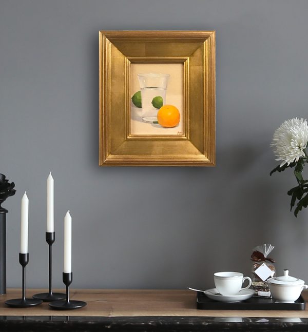 The creation of “Lime, Glass, Orange” followed a careful, layered approach rooted in the classical methods of indirect painting—a tradition that emphasizes patience, observation, and control over form and light. Though modest in scale, the painting required the same disciplined structure and slow accumulation of layers that define much larger and more complex works.