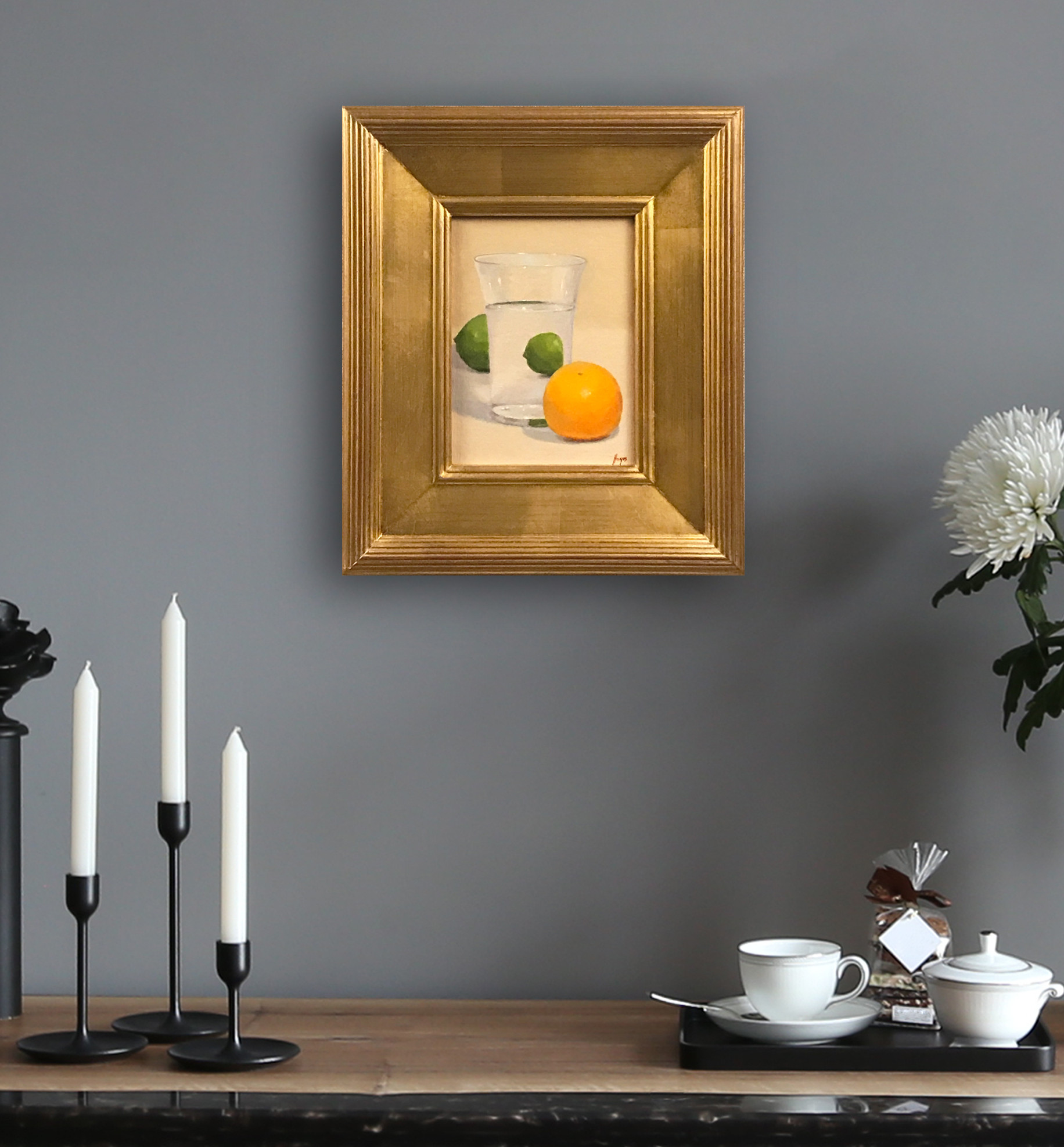 The painting is executed on a fine linen panel, prepared by hand and mounted to a rigid archival support. This surface offers a refined texture ideal for rendering the delicate transitions of light through glass, the soft diffusion of reflected color, and the subtle tonal shifts of fruit in natural light. Unlike stretched canvas, the panel provides a level, stable surface that holds detail with exceptional crispness—particularly important in smaller works where nuance matters.