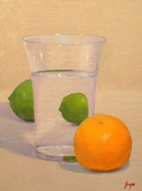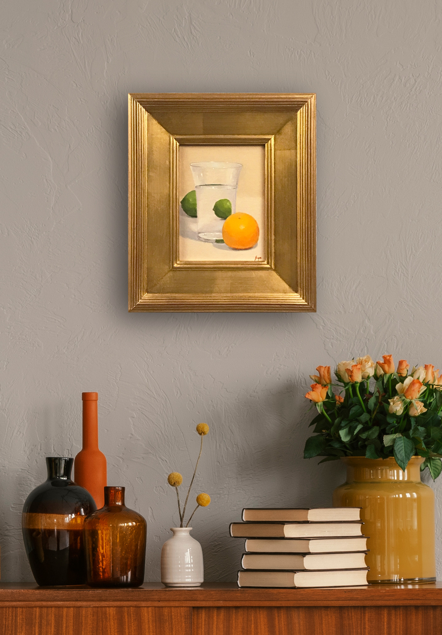 This painting began with a study in quiet clarity—form, light, and the subtle distortions of reflection. A single lime, a tapered glass of water, and the vibrant weight of an orange. Nothing more, and nothing in excess.