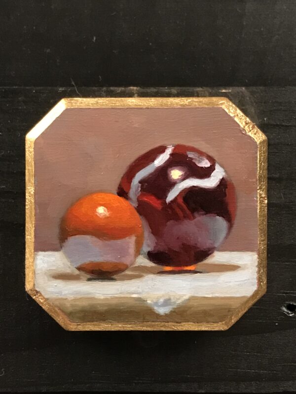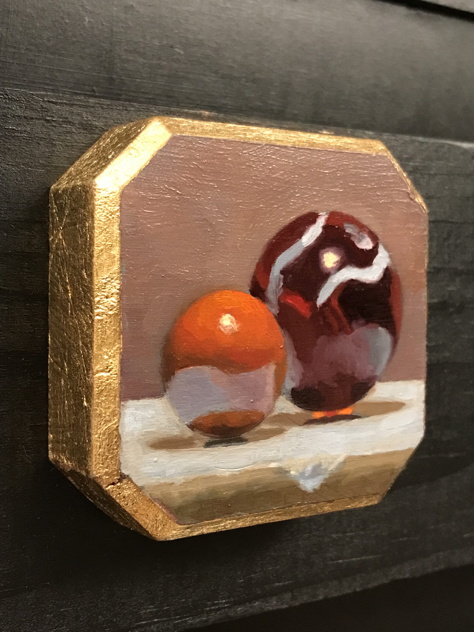 This miniature painting features a pair of red marbles resting on a small marble slab.