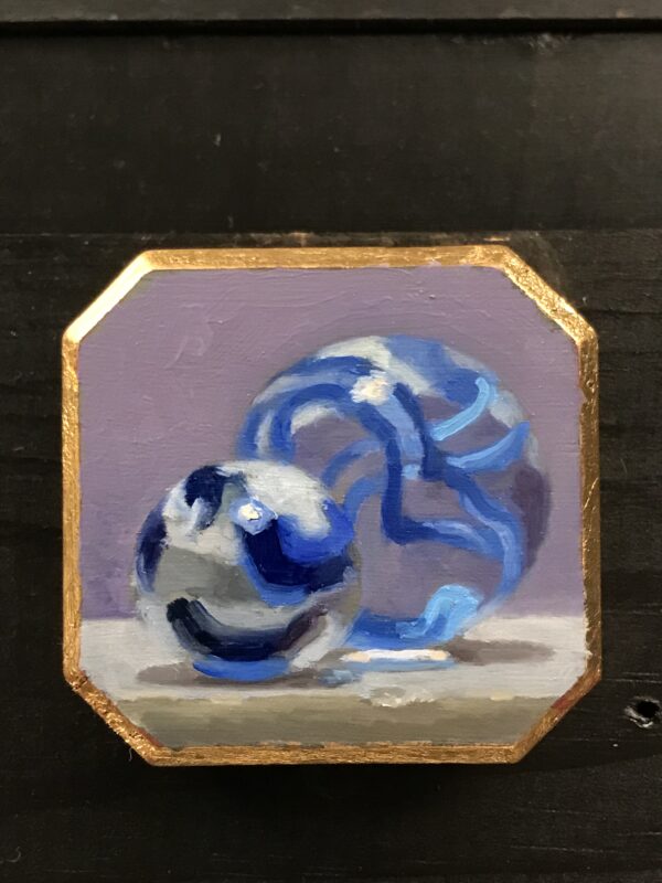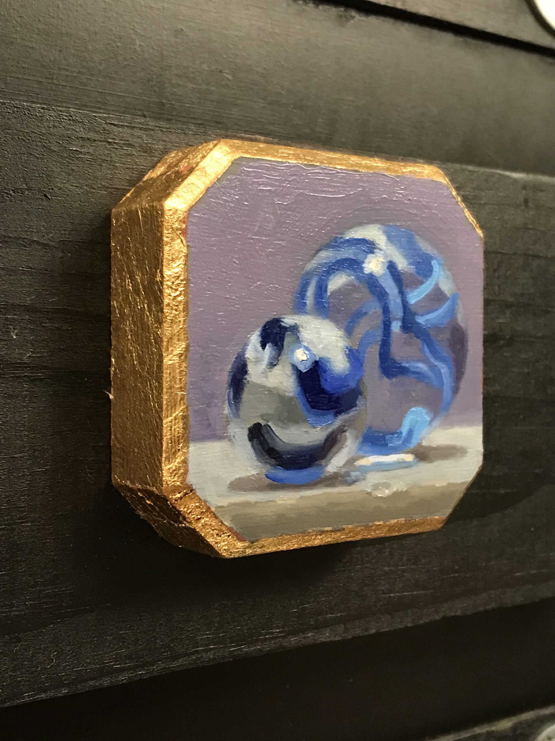 This miniature painting features a pair of red marbles resting on a small marble slab.