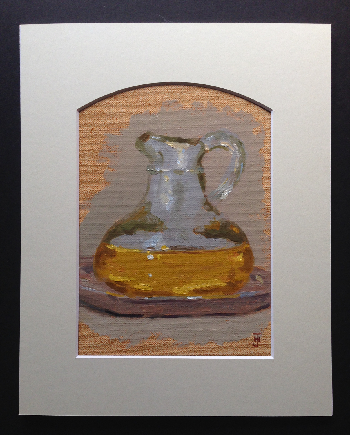 Painted with oil on canvas, this sketch measures 8 x 10 inches (20×25 cm). The painting is presented with the matte shown in the image. This cream-colored matte showcases the painting under a shallow, arched opening – a dramatic presentation. Measuring 8 x 10 inches – a standard size – this painting can immediately and easily be placed in any standard 8×10 frame. Of course, your framer can also create a custom presentation for it.