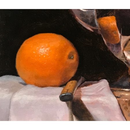 “Orange, Knife, Teapot, Teacup” is an exploration of bold forms and elegant balance. Featuring a striking art deco teapot, fresh orange, wood-handled knife, and gold-trimmed teacup, the arrangement rests on a piece of fine granite and folded white cloth.