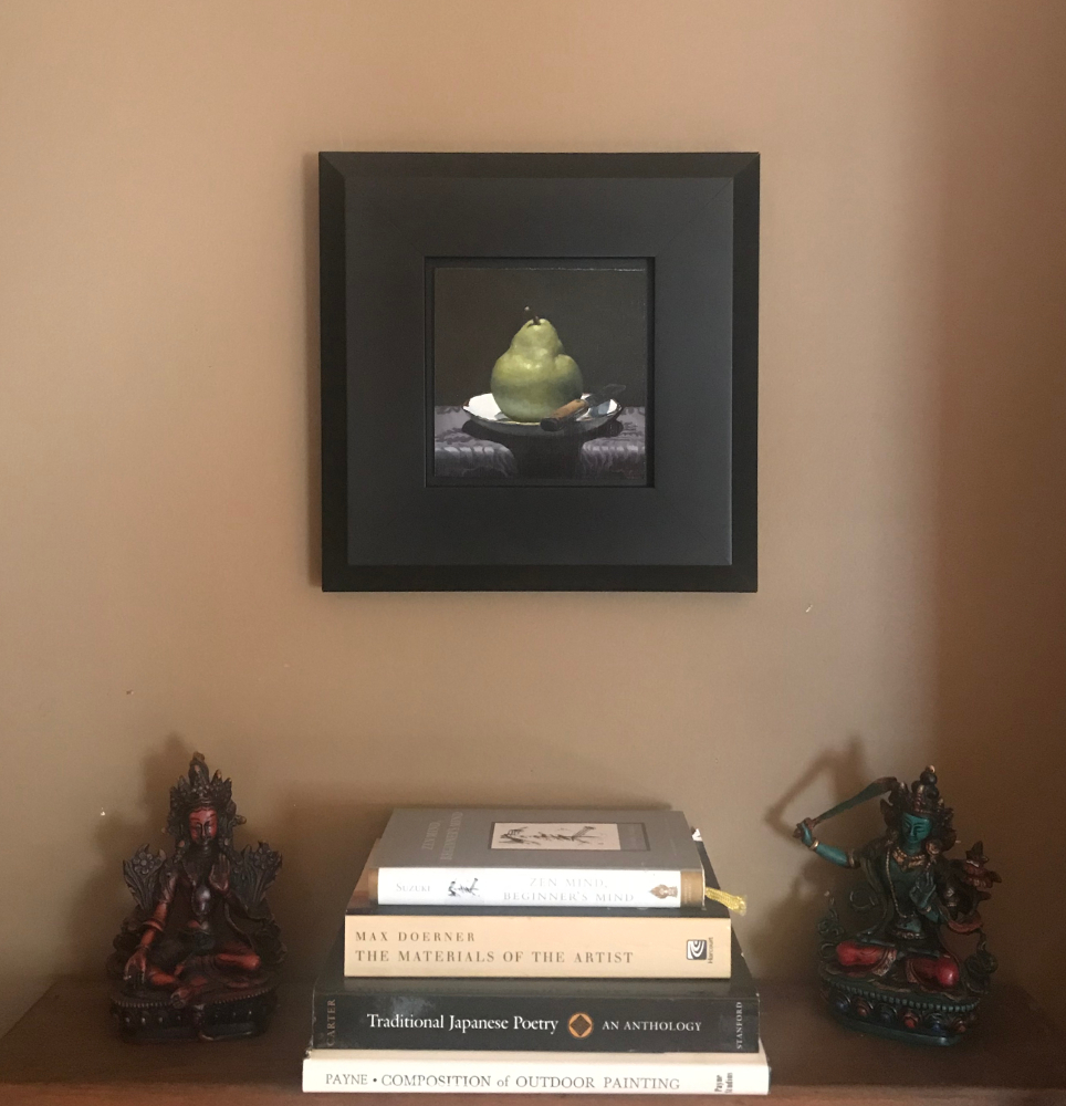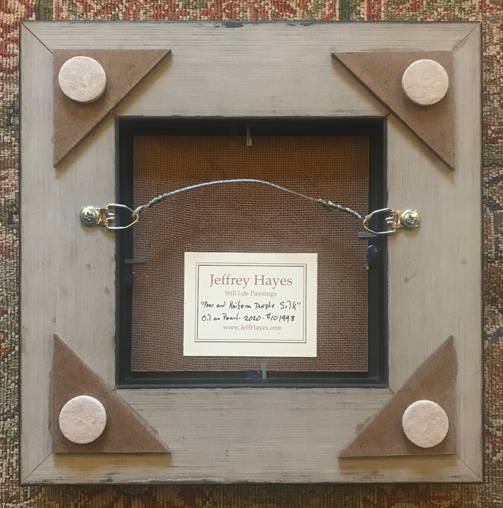 “Pear on Purple Silk” measures 5 x 5 inches (12 x 12 cm), and is presented in a flat panel black frame with a beveled edge. The outer dimensions of the frame are 11 x 11 inches (28 x 28 cm). Felt pads are affixed to each corner of the back of the frame to prevent any damage to your wall and to ensure that the painting rests perfectly parallel to the wall.