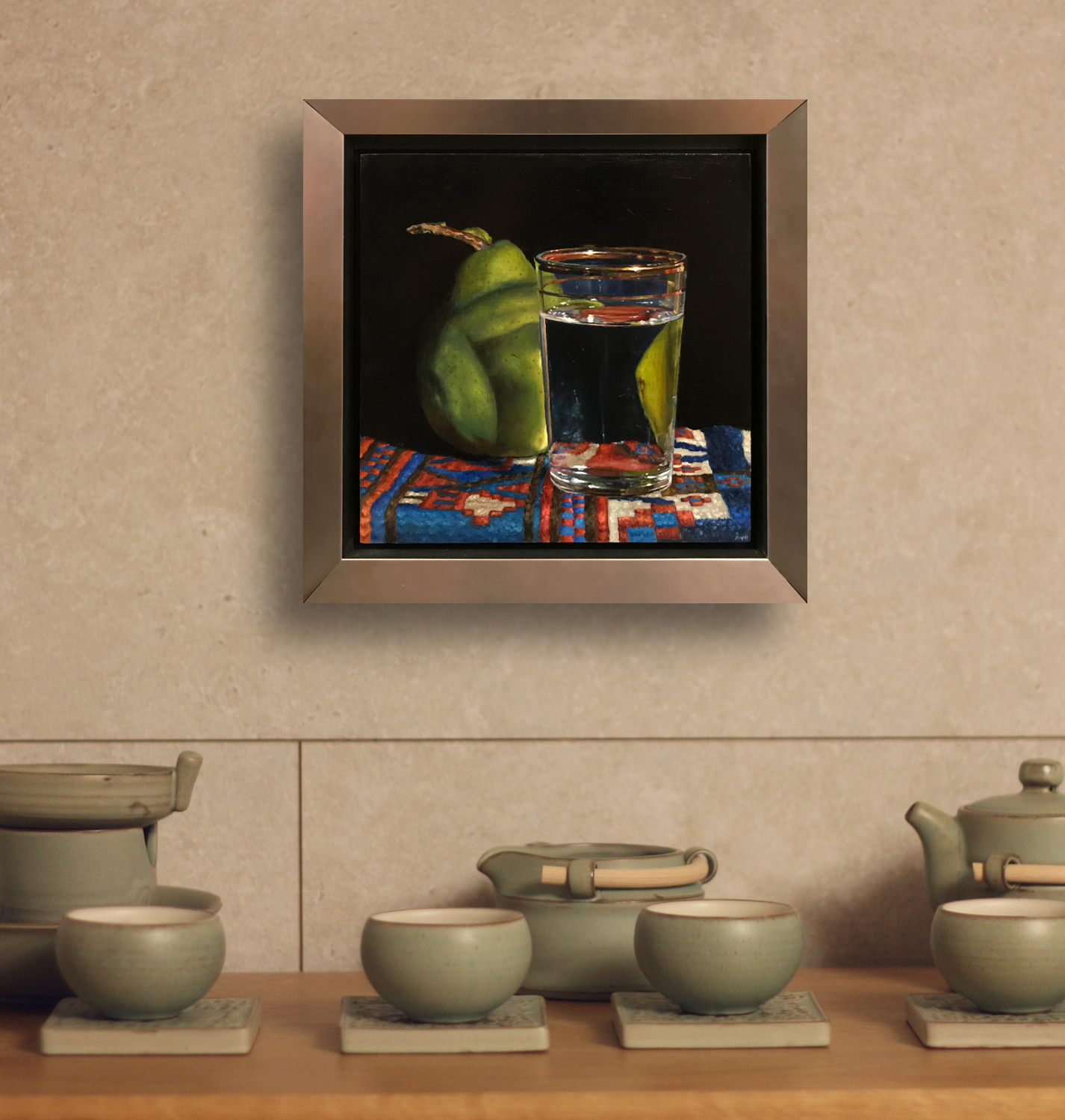 “Pear, Waterglass, and Oriental Rug” measures 12 × 12 inches (30 × 30 cm) and is painted with oil on prepared panel, following time-tested traditional methods.