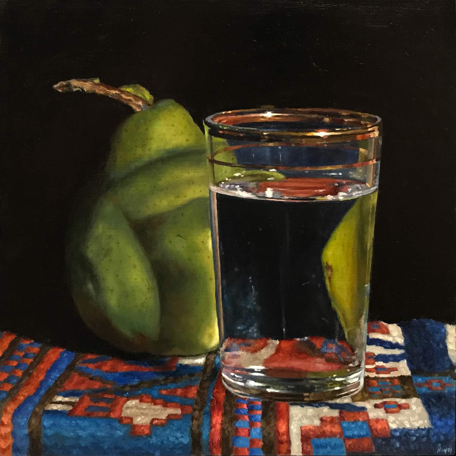 “Pear, Waterglass, and Oriental Rug” is an original still life painting, created with oil on prepared canvas.