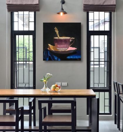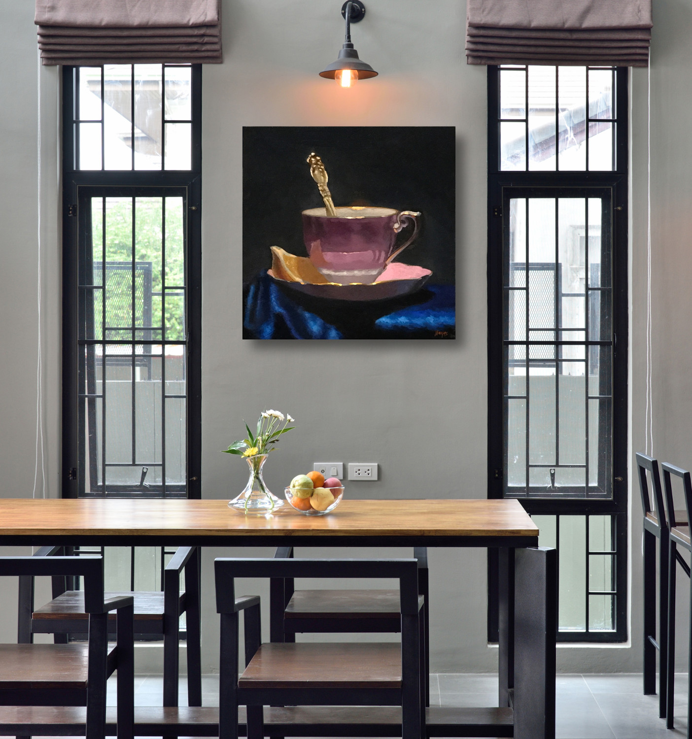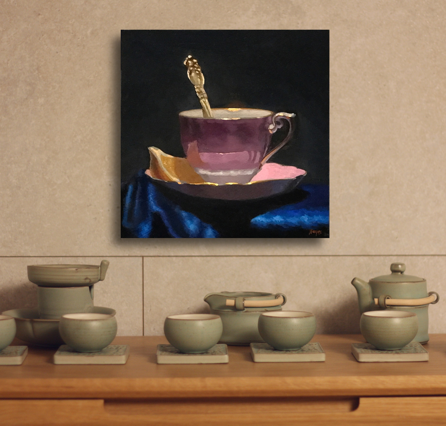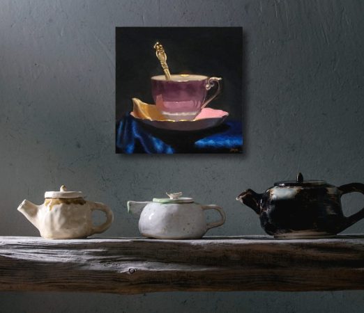 “Pink Teacup and Blue Cloth” features a delicate pink teacup, sliced lemon, and silver spoon, all resting on a rich blue velvet cloth.