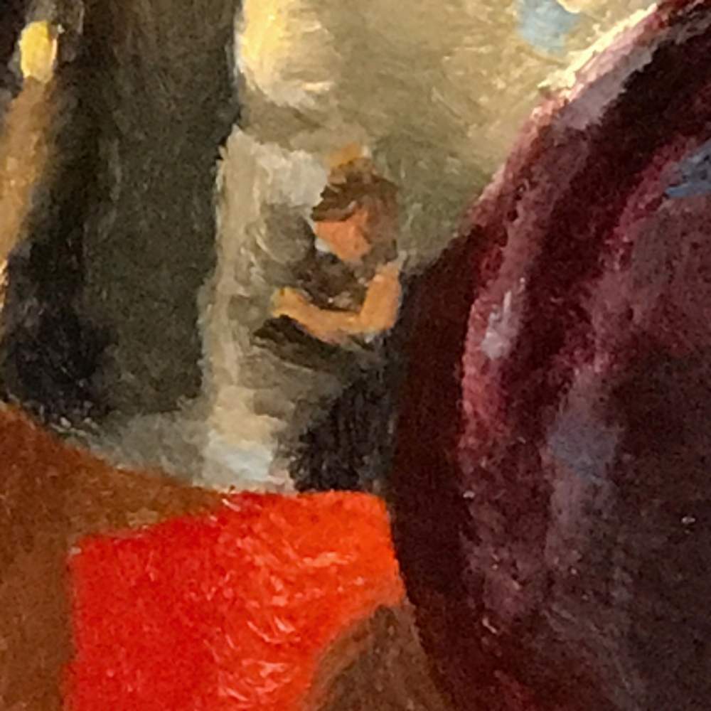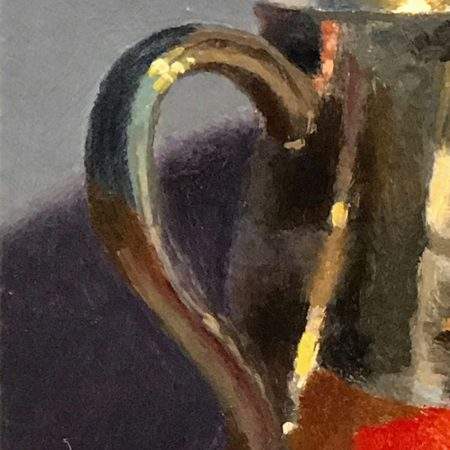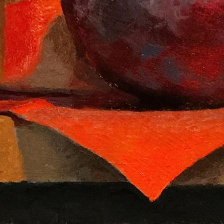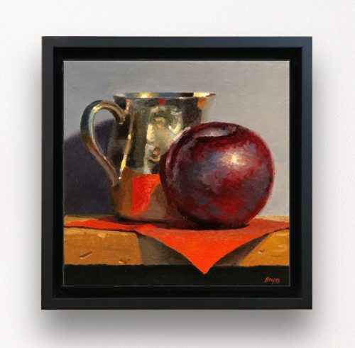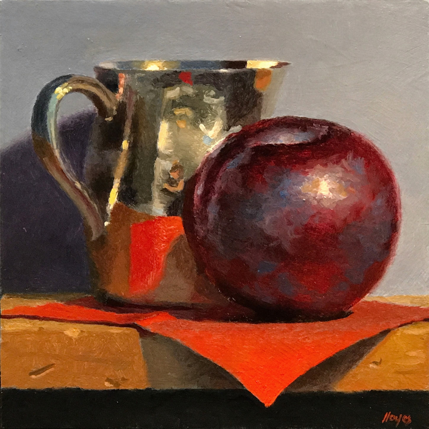 “Plum, Silver Creamer, Red Napkin” captures just such a contemplative moment in the studio, featuring a fresh plum and silver creamer resting on a colorful red napkin – there is even a small reflected image of the artist quietly at work.