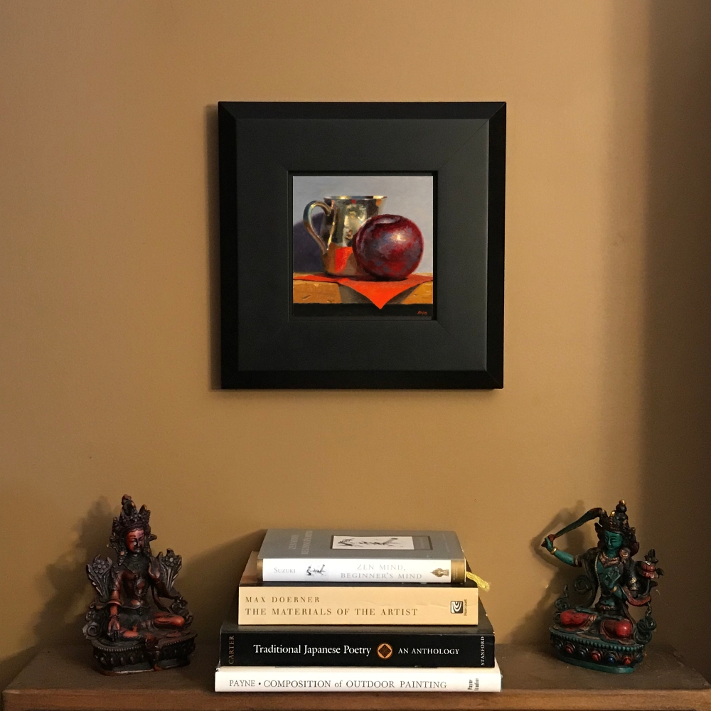 “Plum, Silver Creamer, Red Napkin” is made with the best materials using painstaking traditional methods. (visit my process page to learn more about how these paintings are created)
