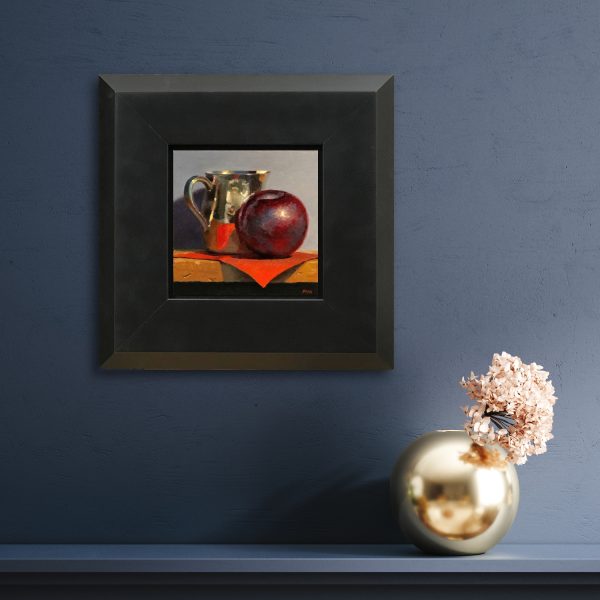 Capturing a still, contemplative moment; it features a fresh plum and silver creamer resting on a colorful red napkin – there is even a small reflected image of the artist quietly at work.