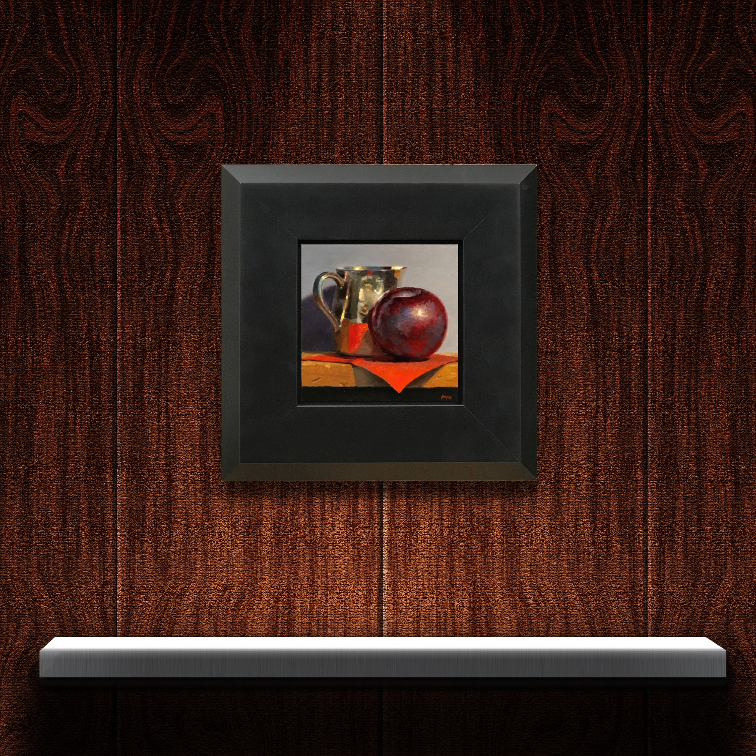 “Plum, Silver Creamer, Red Napkin” is an original still life painting, done with oil on panel.