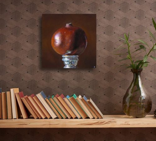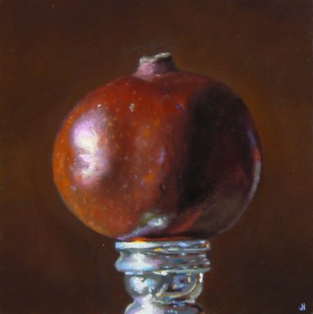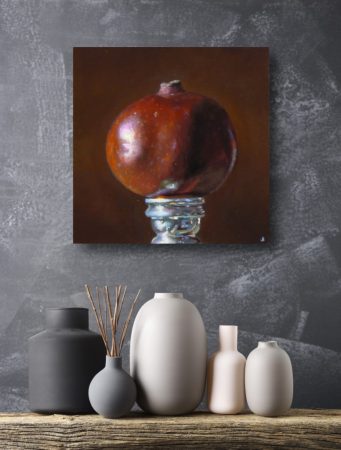 “Pomegranate No. 3” features a ripe pomegranate against a deep rich red background, resting on a silver candlestick from the Mexican city of Cuernavaca.