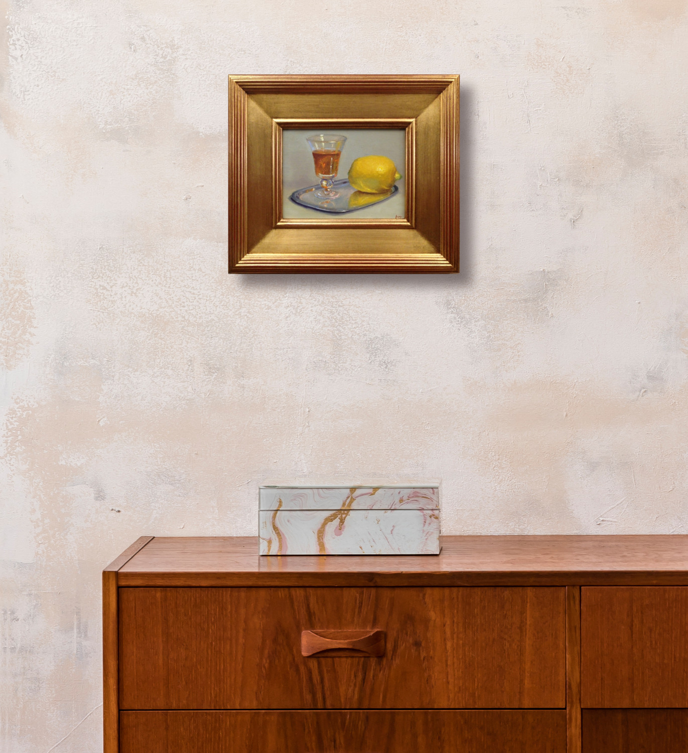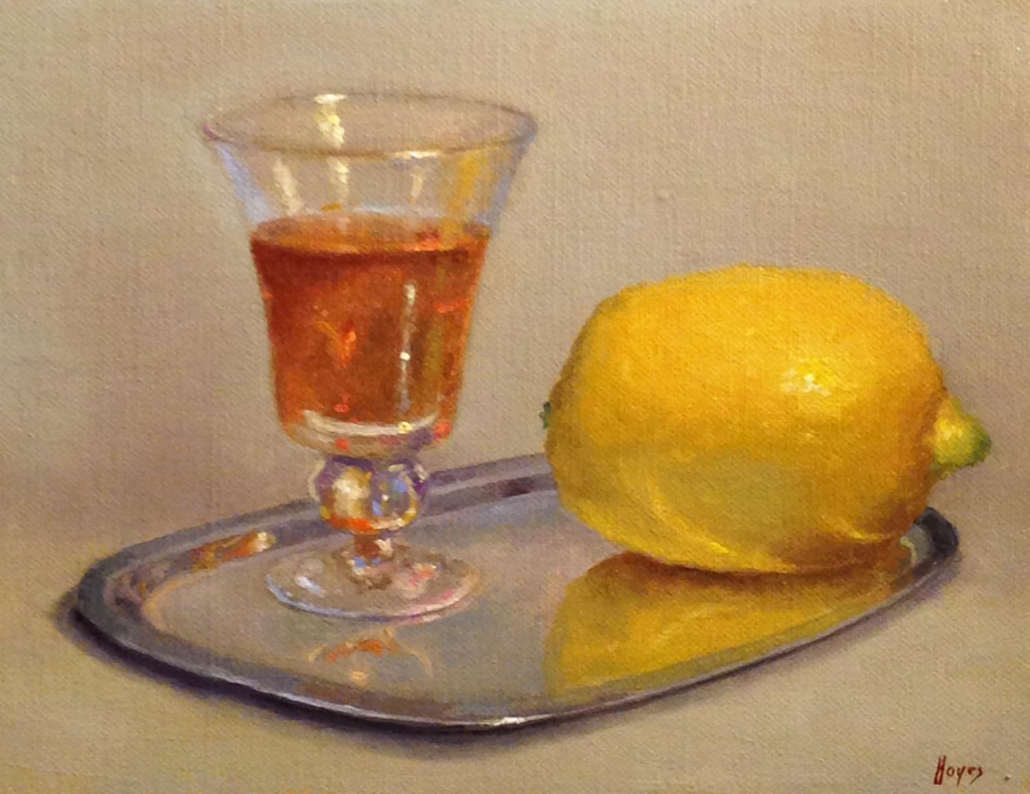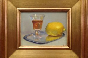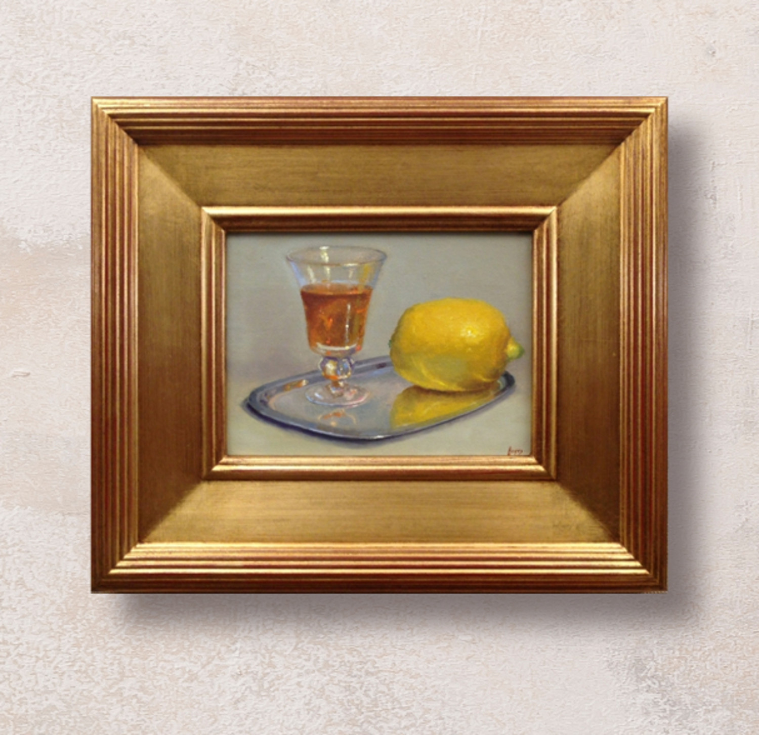 “Port and Lemon” is an original still life painting, done with oil on linen.