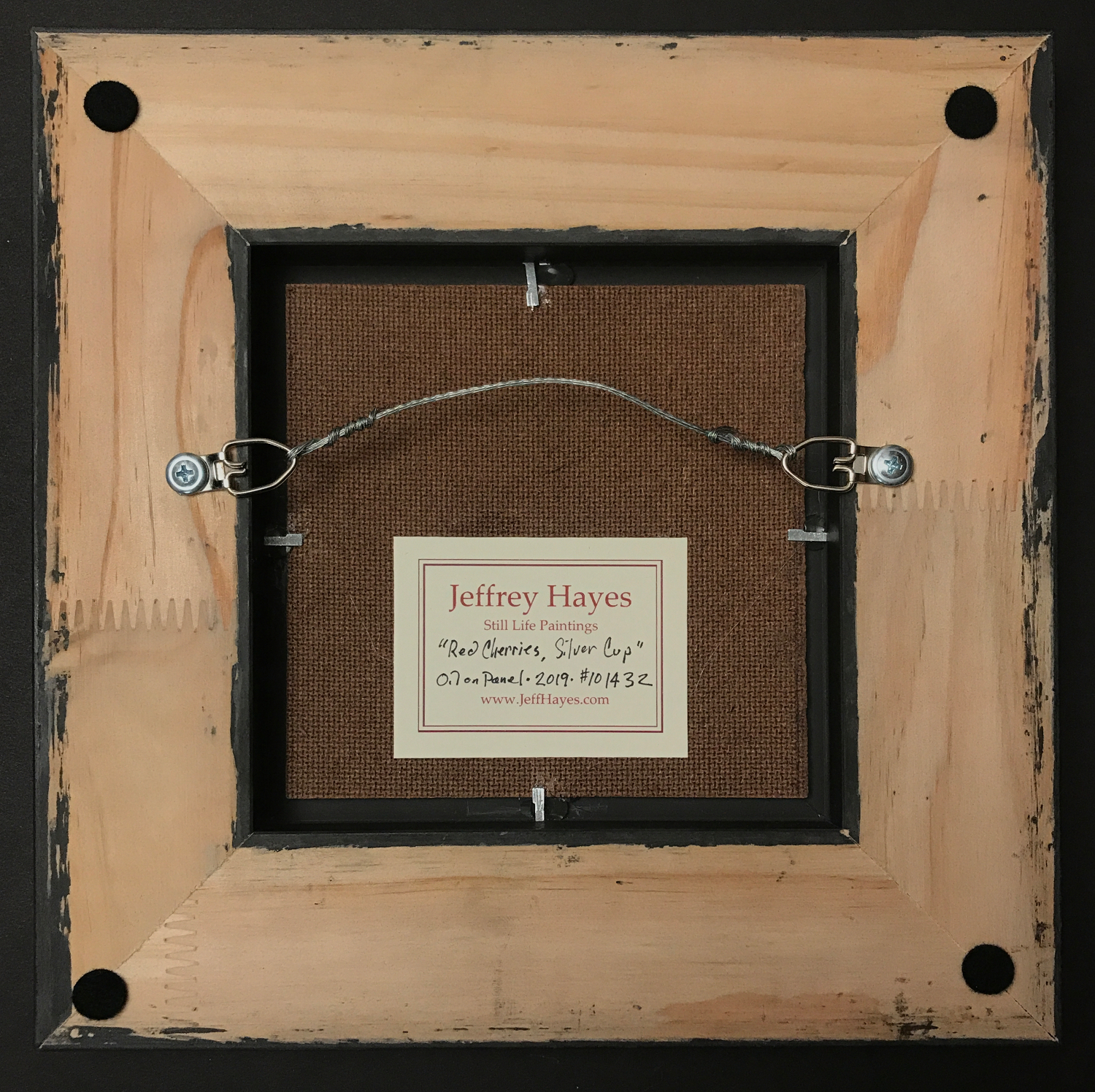 “Red Cherries, Silver Cup” measures 5 x 5 inches (12 x 12 cm), and is presented in a flat panel black frame with a beveled edge. The outer dimensions of the frame are 11 x 11 inches (28 x 28 cm). Felt pads are affixed to each corner of the back of the frame to prevent any damage to your wall and to ensure that the painting rests perfectly parallel to the wall.